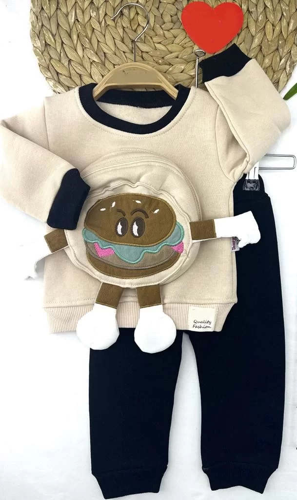 9-12-18-24 Ay Hamburger Figürlü Kendinden Çantalı 3 İp Kumaş 2li Kız Erkek Bebek Takımı