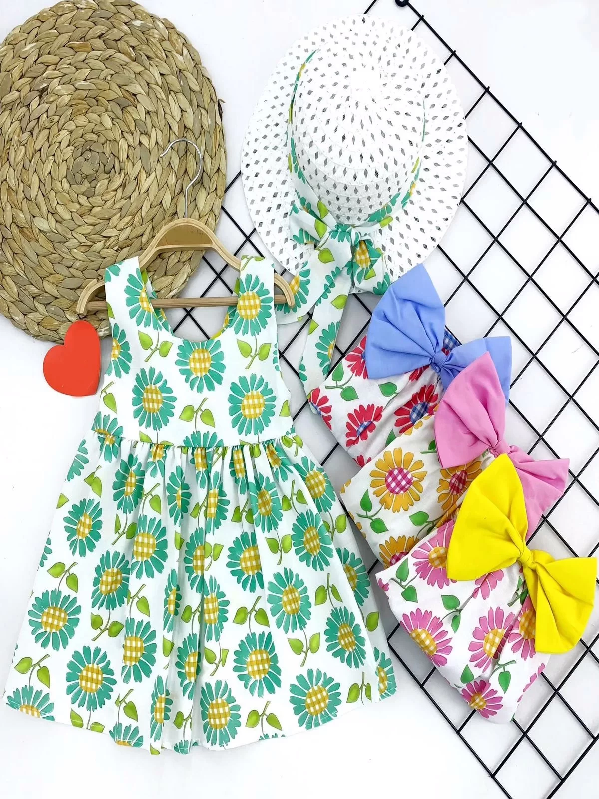 9-12-18-24 Ay Hasır Şapkalı Ekose Papatya Desenli Askılı 2li Kız Bebek Elbisesi