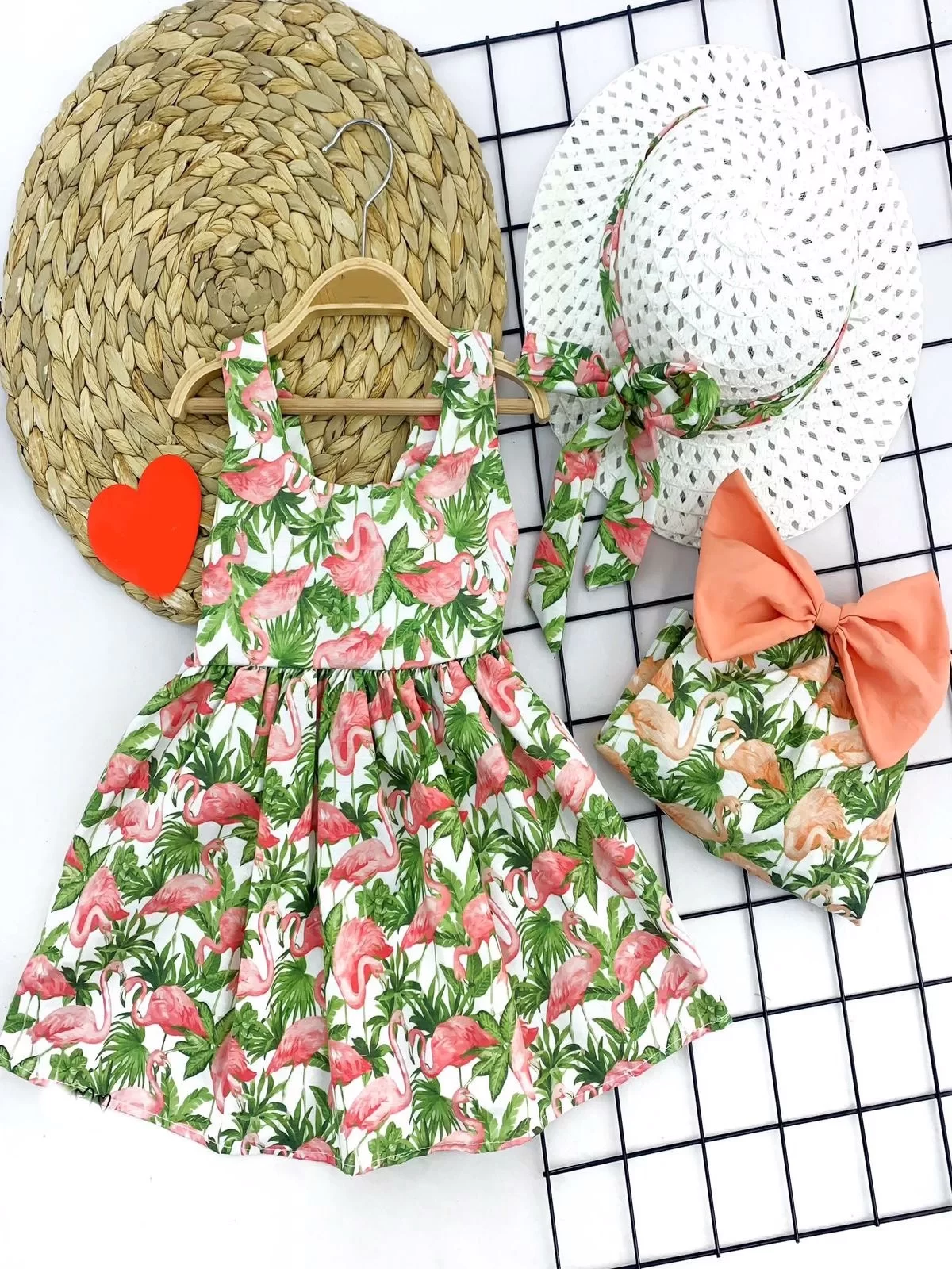 9-12-18-24 Ay Hasır Şapkalı Flamingo Desenli Askılı 2li Kız Bebek Elbisesi Turuncu