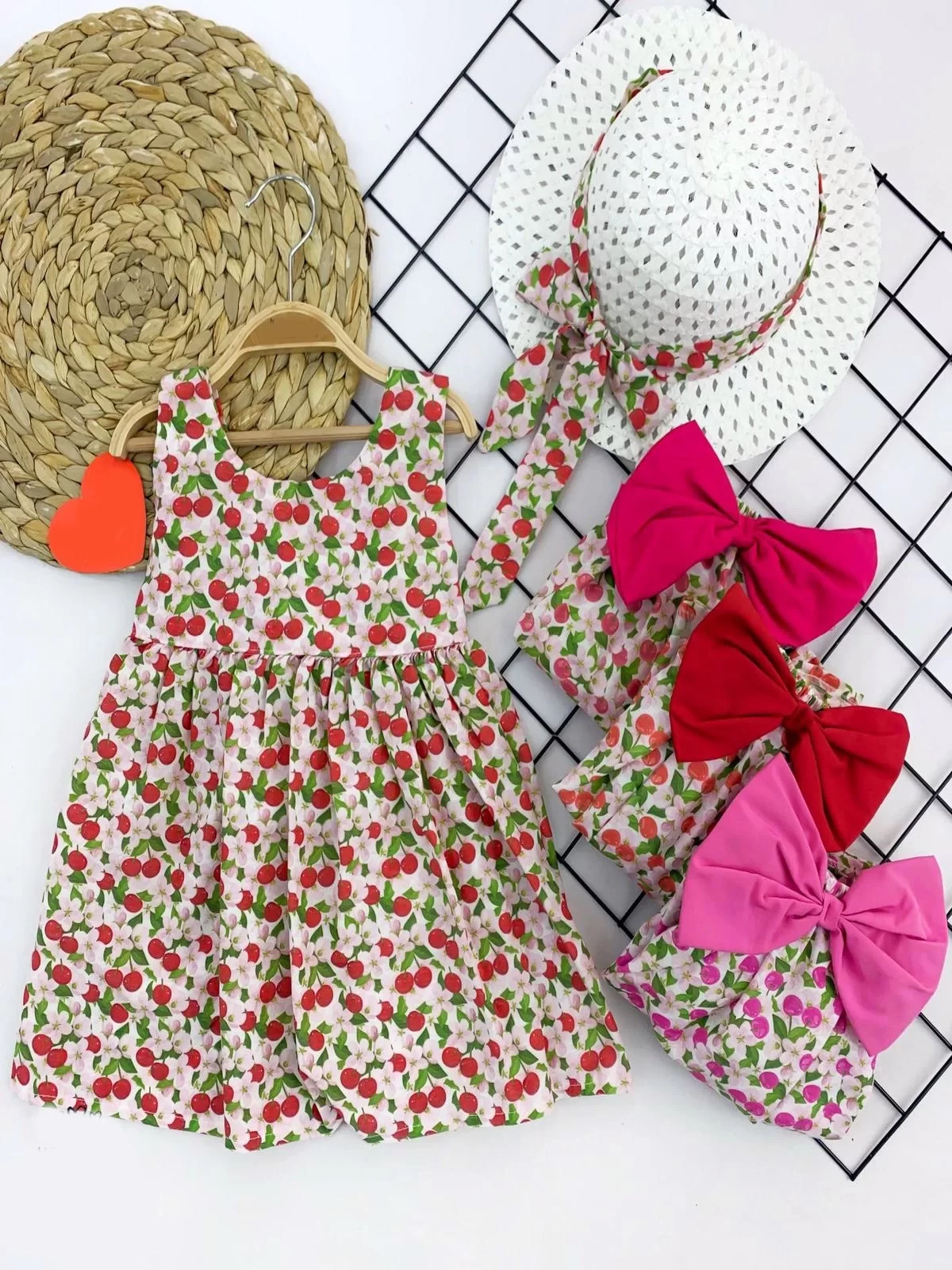 9-12-18-24 Ay Hasır Şapkalı Kiraz Desenli Askılı 2li Kız Bebek Elbisesi