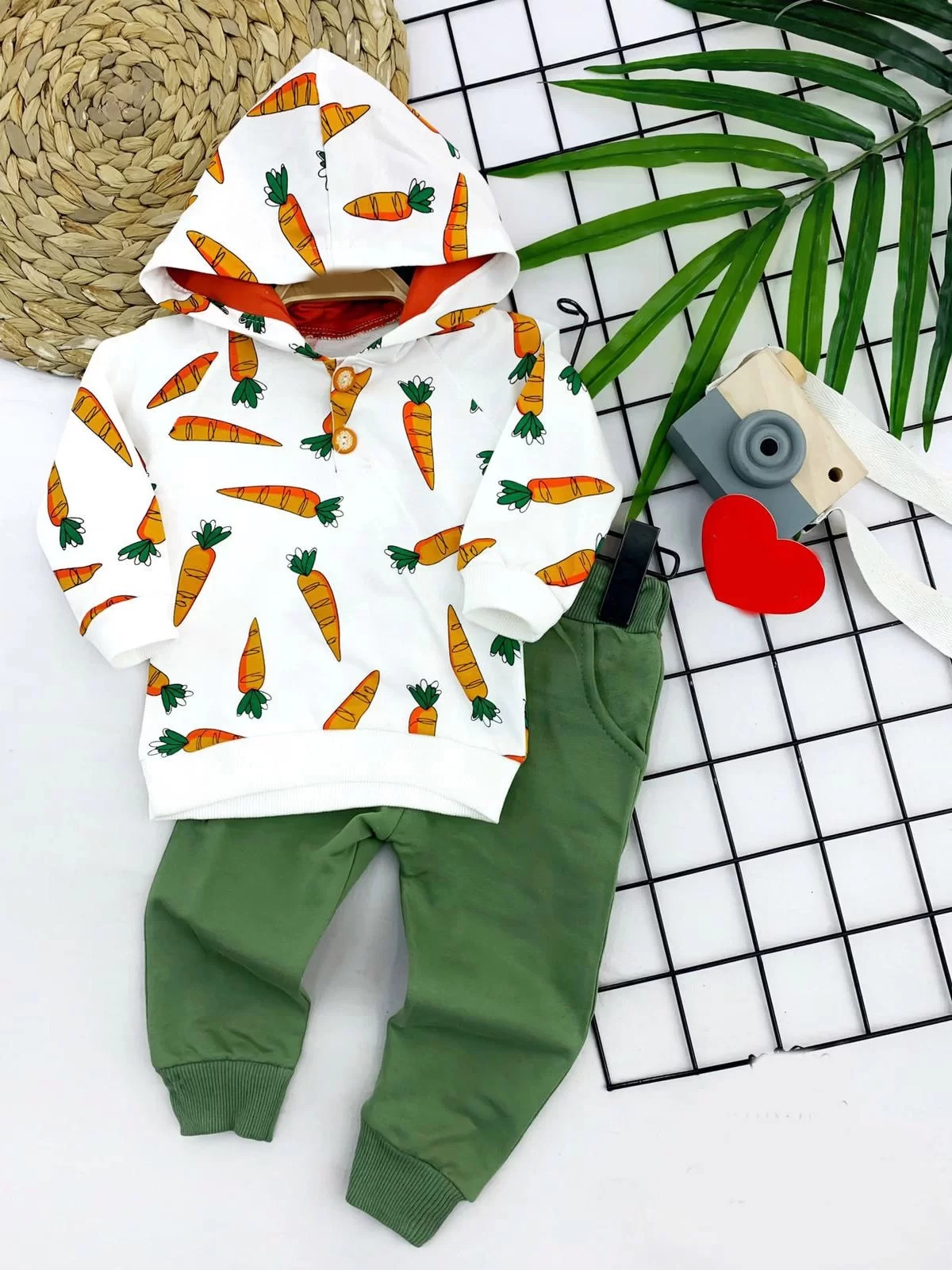 9-12-18-24 Ay Havuç Desenli Kapşonlu Uzun Kollu Sweat 2li Kız Erkek Bebek Takımı
