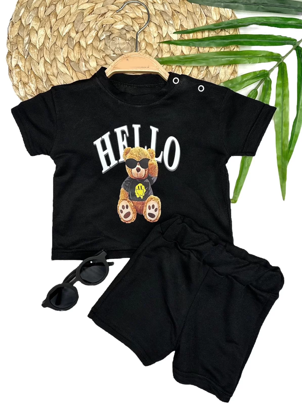 9-12-18-24 Ay Hello Gözlüklü Ayıcık Baskılı Şortlu Kısa Kollu Tişört 2li Erkek Bebek Takımı