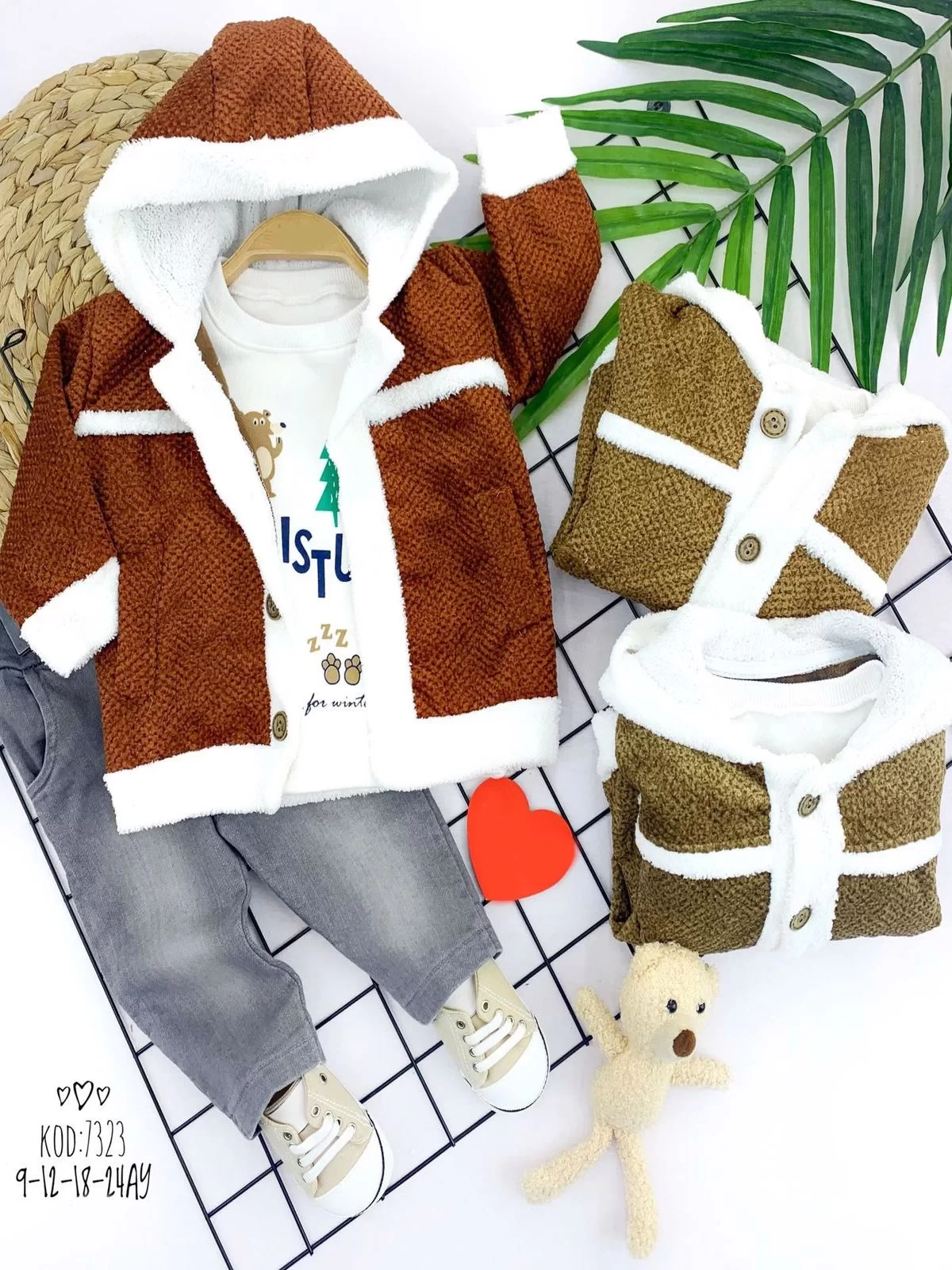 9-12-18-24 Ay İçi Welsoft Düğmeli Kapşonlu Triko Ceket Sweatli Kot Pantolon 3lü Erkek Bebek Takımı