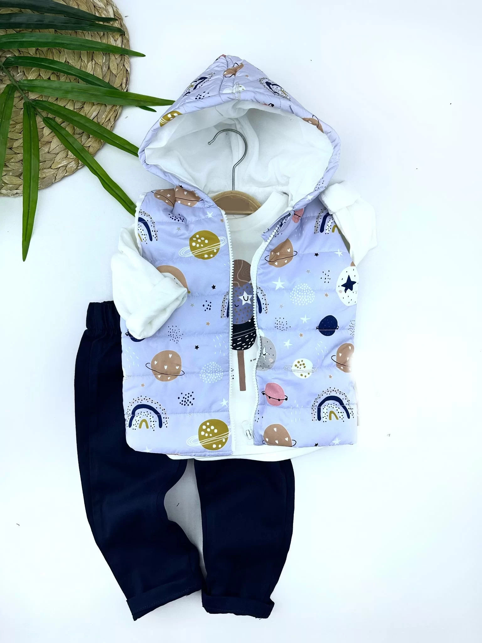 9-12-18-24 Ay Kapşonlu Fermuarlı Galaksi Şişme Yelek Sweat Pantolonlu 3lü Kız Erkek Bebek Takımı Lila