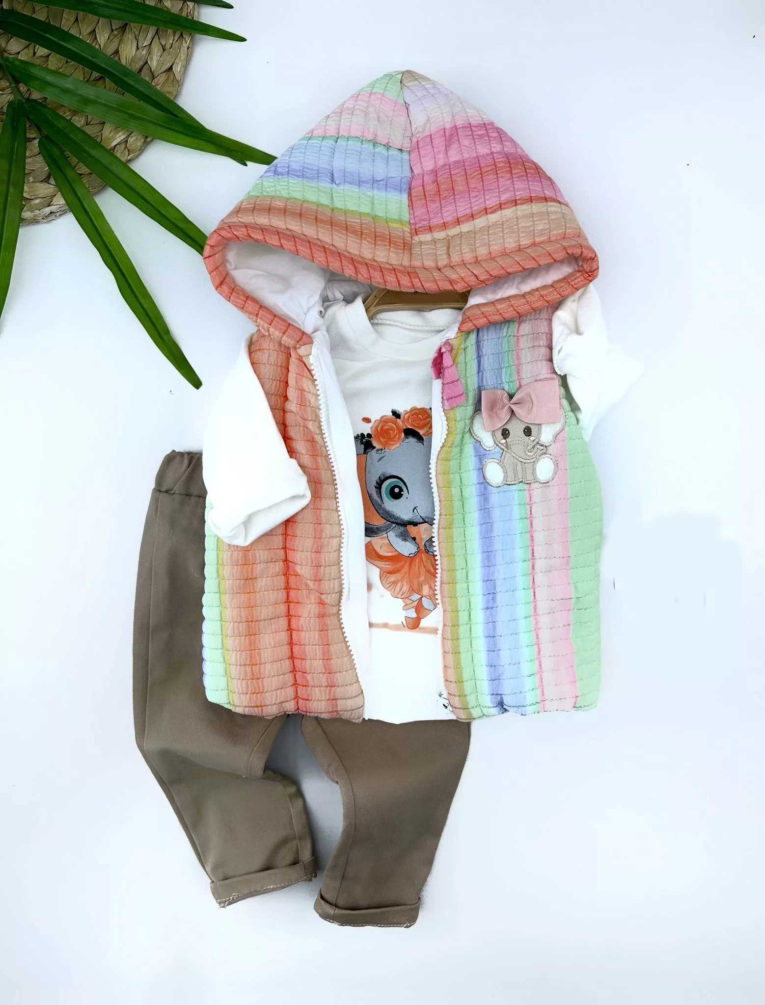 9-12-18-24 Ay Kapşonlu Fermuarlı Gökkuşağı Şişme Yelek Sweat Pantolonlu 3lü Kız Erkek Bebek Takımı Kahverengi