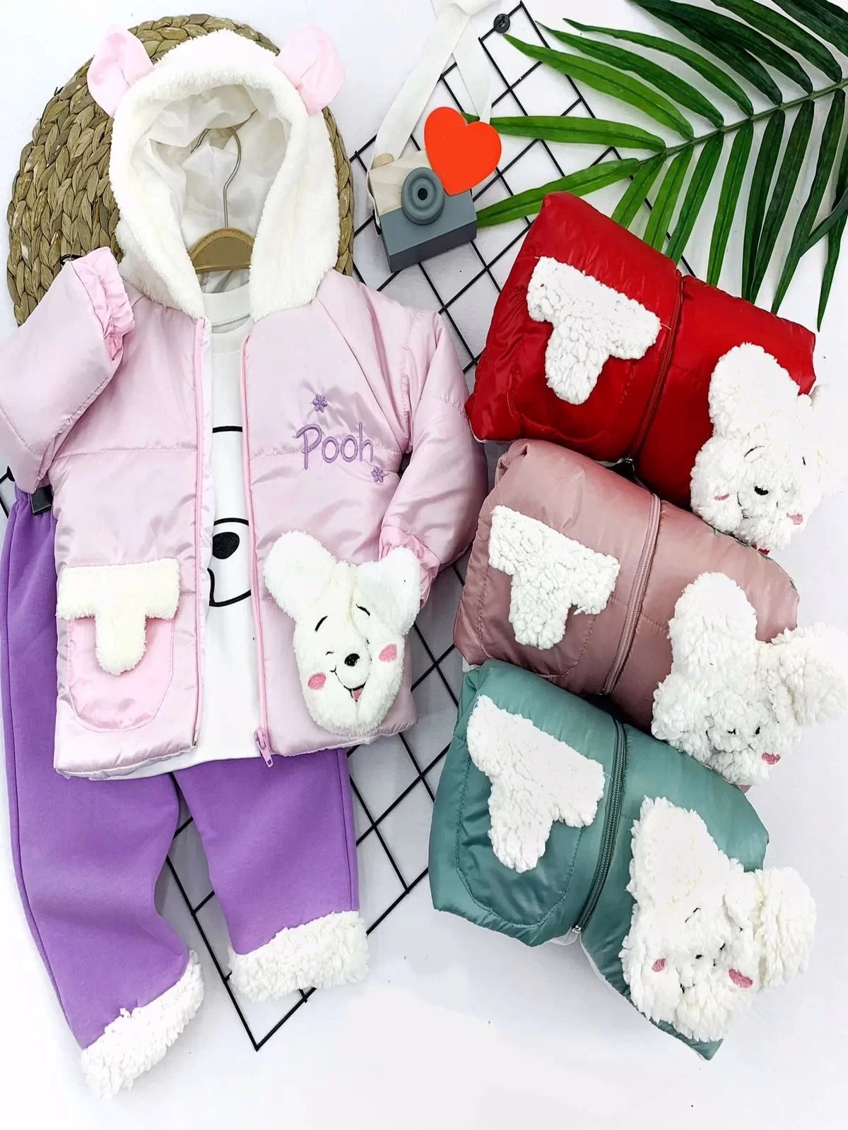 9-12-18-24 Ay Kapşonlu Fermuarlı Mont Pantolon Uzun Kollu Sweatli 3lü Kız Bebek Takımı Pembe