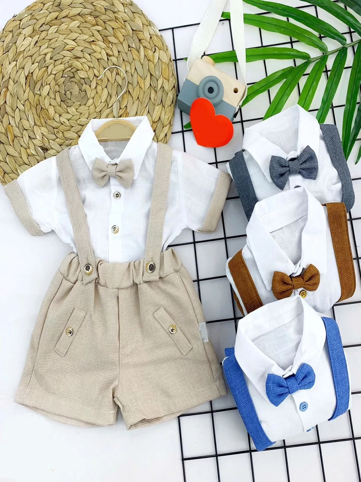 9-12-18-24 Ay Pamuk Kumaş Keten Papyonlu Kısa Kol 2li Erkek Bebek Salopet Takımı