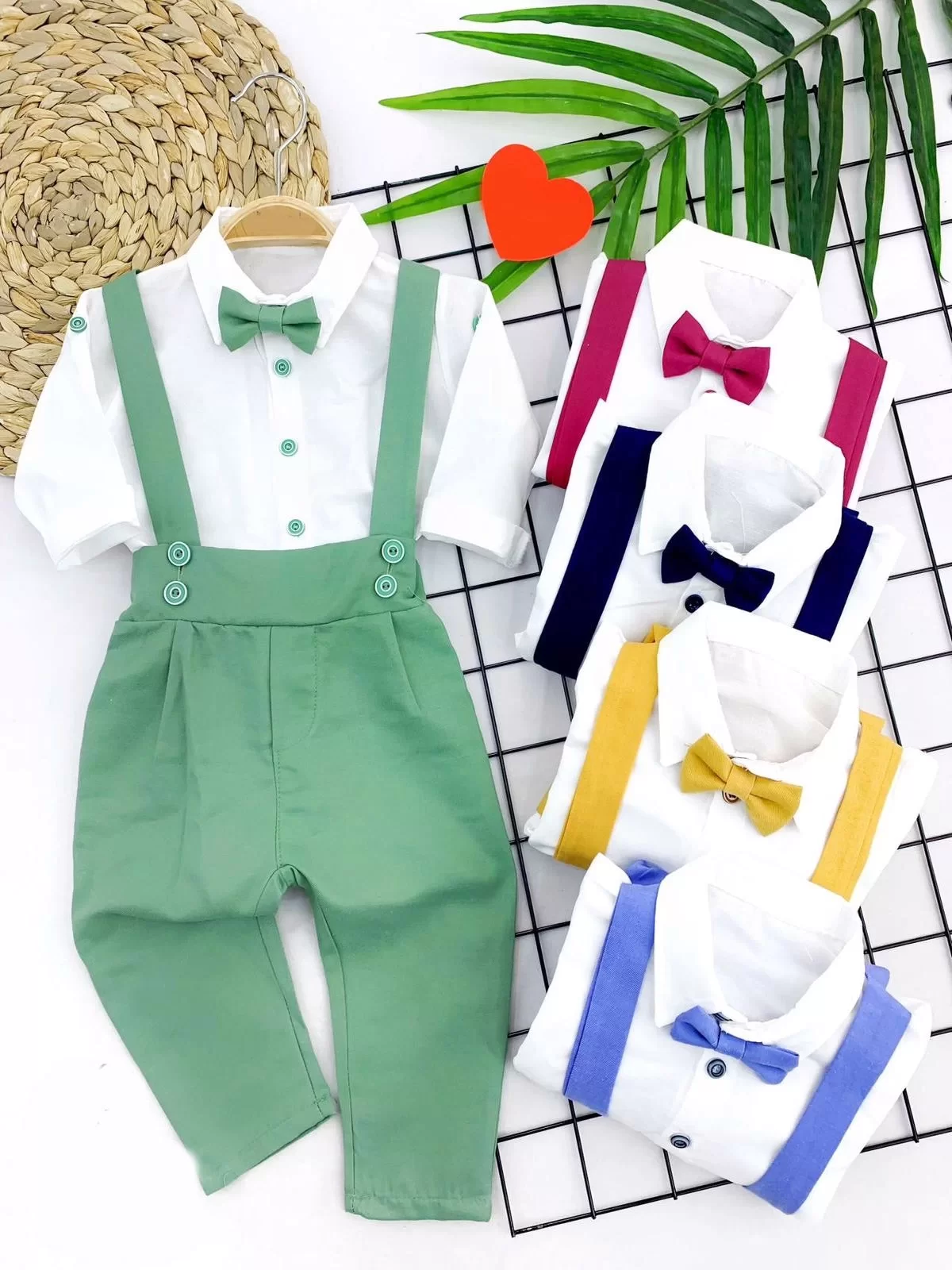 9-12-18-24 Ay Pamuk Kumaş Papyonlu Gömlek 2li Erkek Bebek Salopet Takımı
