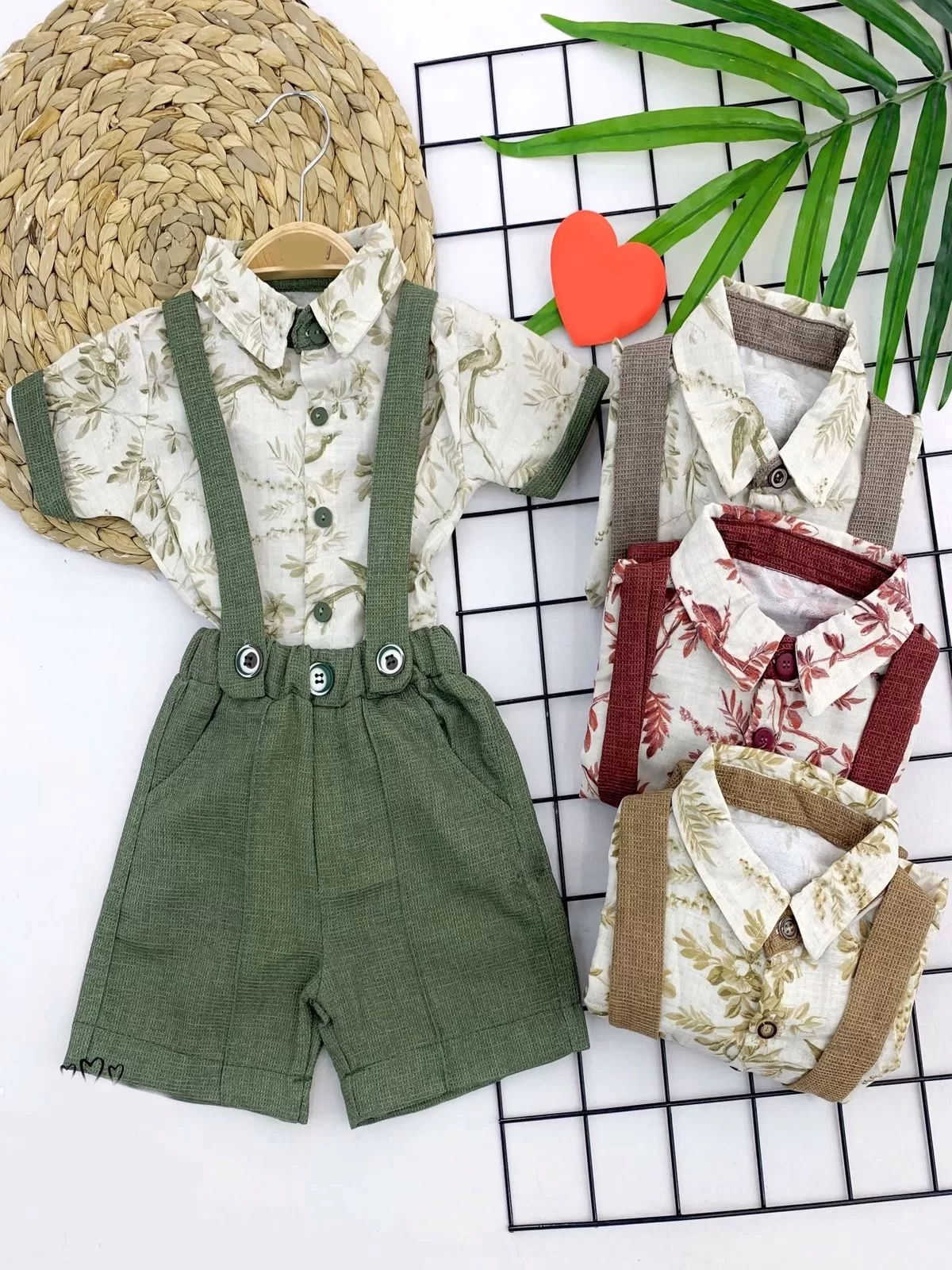 9-12-18-24 Ay Pamuklu Kumaş Keten Kısa Kol Gömlek 2li Erkek Bebek Salopet Takımı