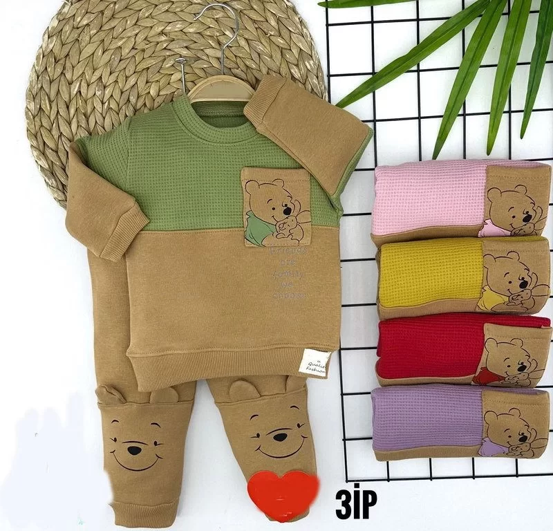 9-12-18-24 Ay Pooh Ayıcık Baskılı Tek Cepli Uzun Kollu 2li Kız Erkek Bebek Takımı