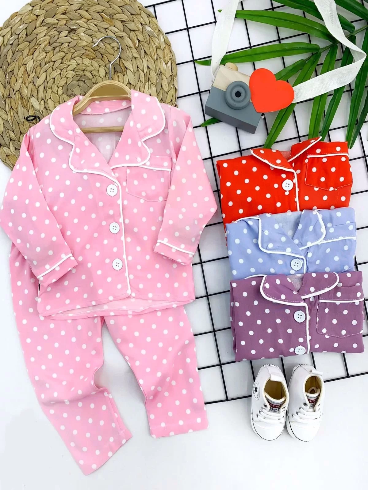 9-12-18-24 Ay Puantiyeli Düğme Kapama 2li Kız Erkek Bebek Pijama Takımı Kırmızı adet