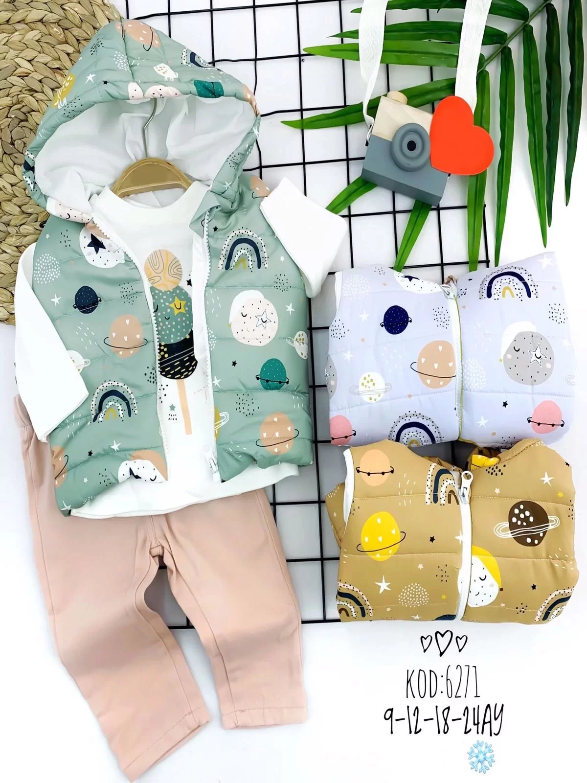 9-12-18-24 Ay Şişme Kapşonlu Yelek Galaksi Gezegenler Baskılı Uzun Kollu Sweat 3lü Kız Bebek Takımı