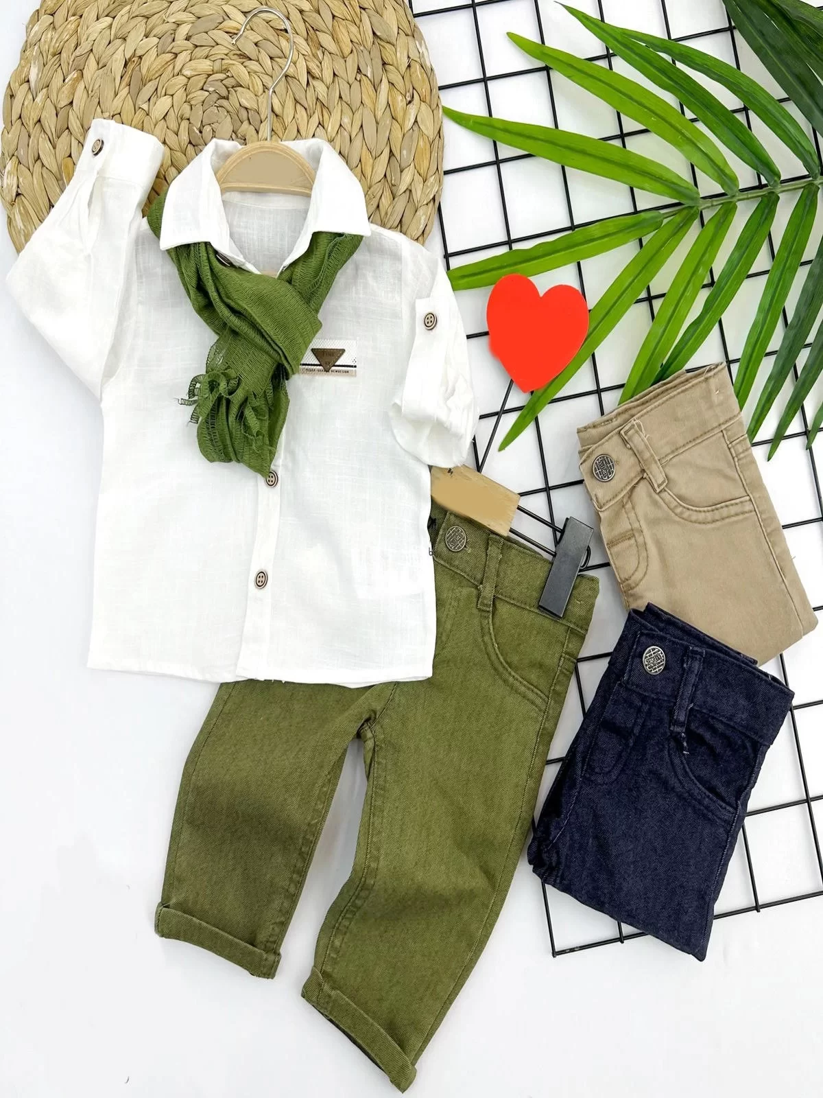 9-12-18-24 Ay Ve 3-4-5 Yaş Fularlı Pamuk Keten Gömlekli Pantolonlu 3lü Erkek Bebek Takımı Yeşil