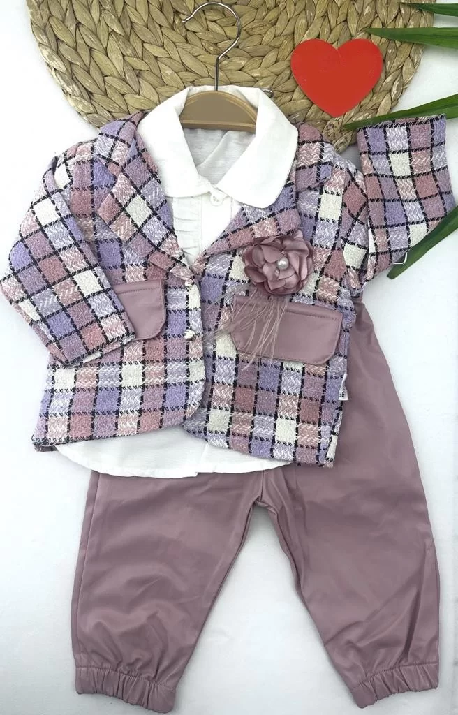 9-12-18-24 Ay Yaka Gül Detaylı Cepli Ceketli Uzun Kollu Örme Kumaş Kız Bebek Takımı