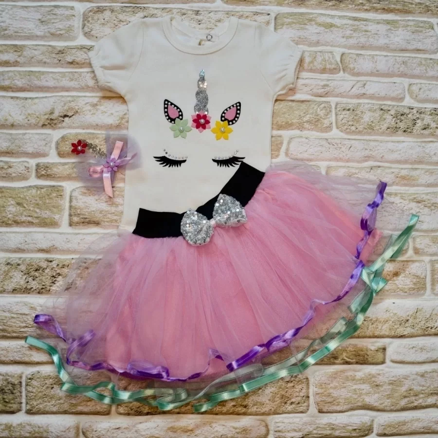 9-12-18 Ay Payetli Pony Nakışlı Tokalı Kısa Kollu Tütü Etek 3lü Kız Bebek Takımı Lila