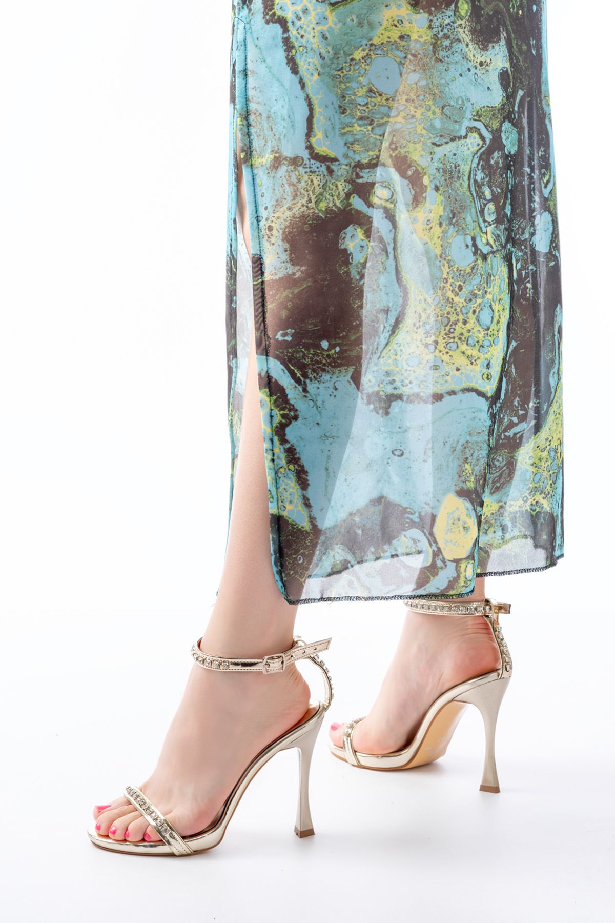 A-30 Gold Taş Aksesuarlı Platformlu Topuklu Kadın Terlik