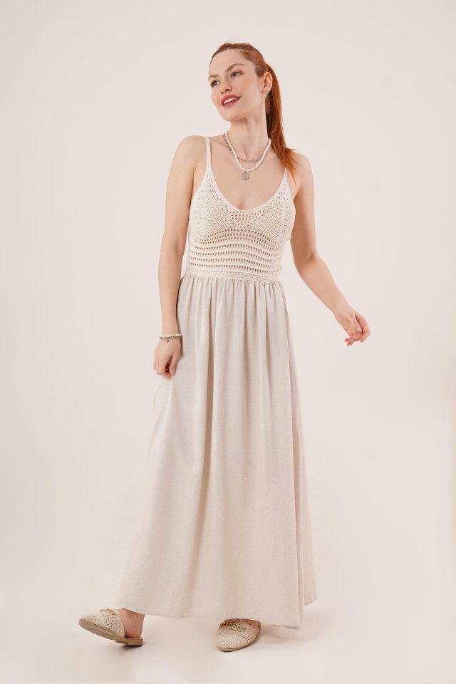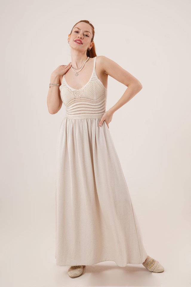 Ajurlu Askılı Belden Oturtmalı Maxi Krem Elbise