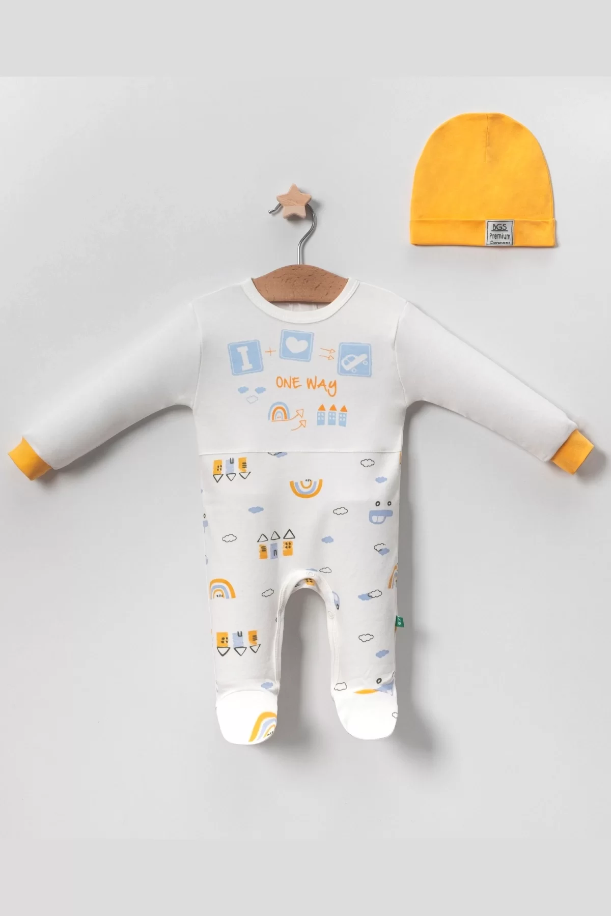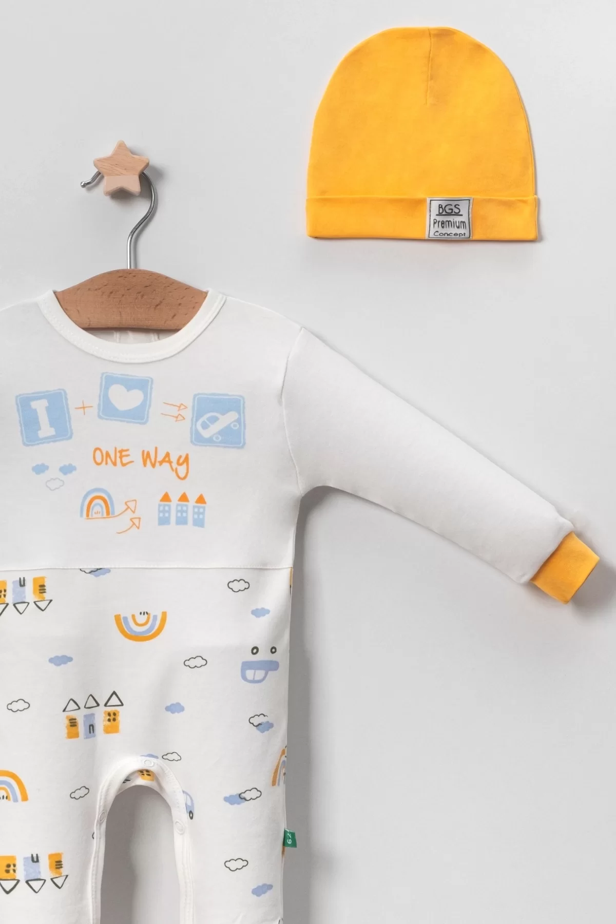 Araba Desenli Sarı 2’li Şapkalı Erkek Bebek Tulumu