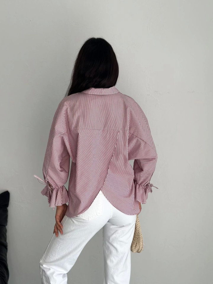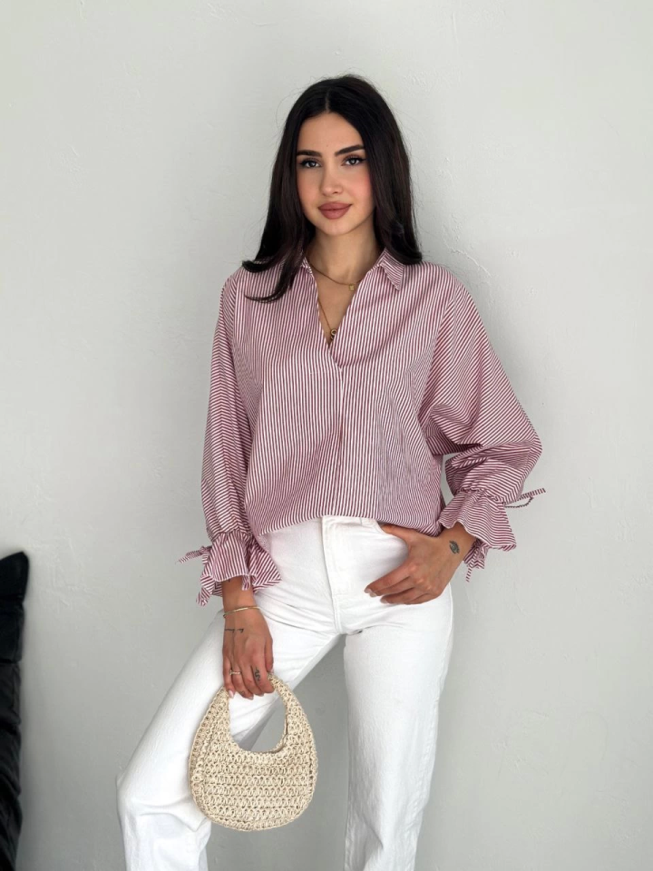Arkası Asimetrik Yırtmaç Kesim Detaylı Cizgili Bluz Gömlek – Bordo