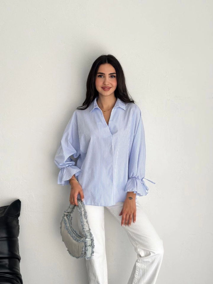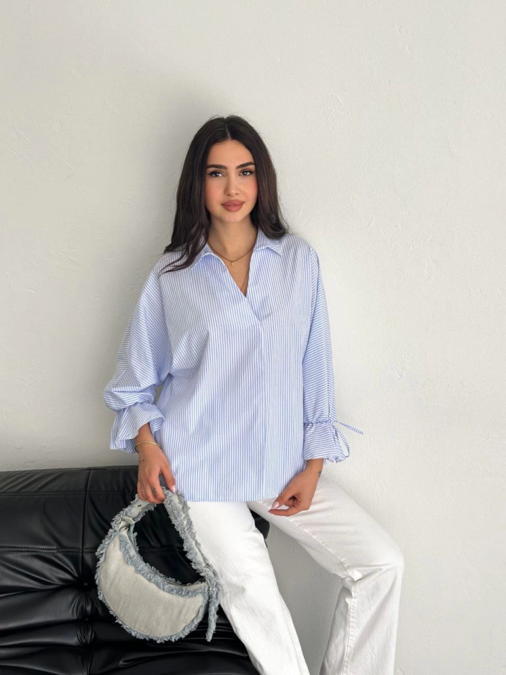 Arkası Asimetrik Yırtmaç Kesim Detaylı Cizgili Bluz Gömlek – Mavi
