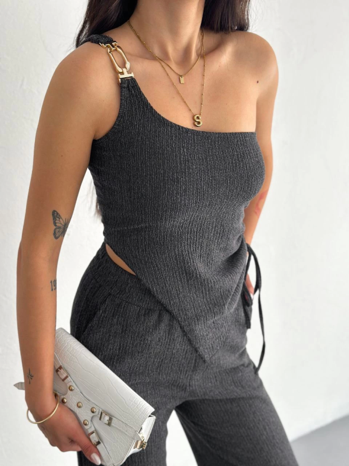 Asimetrik Crop Pantalon Ikili Takım – Füme