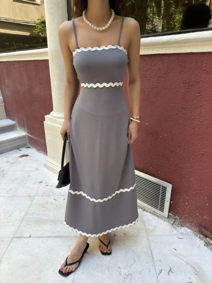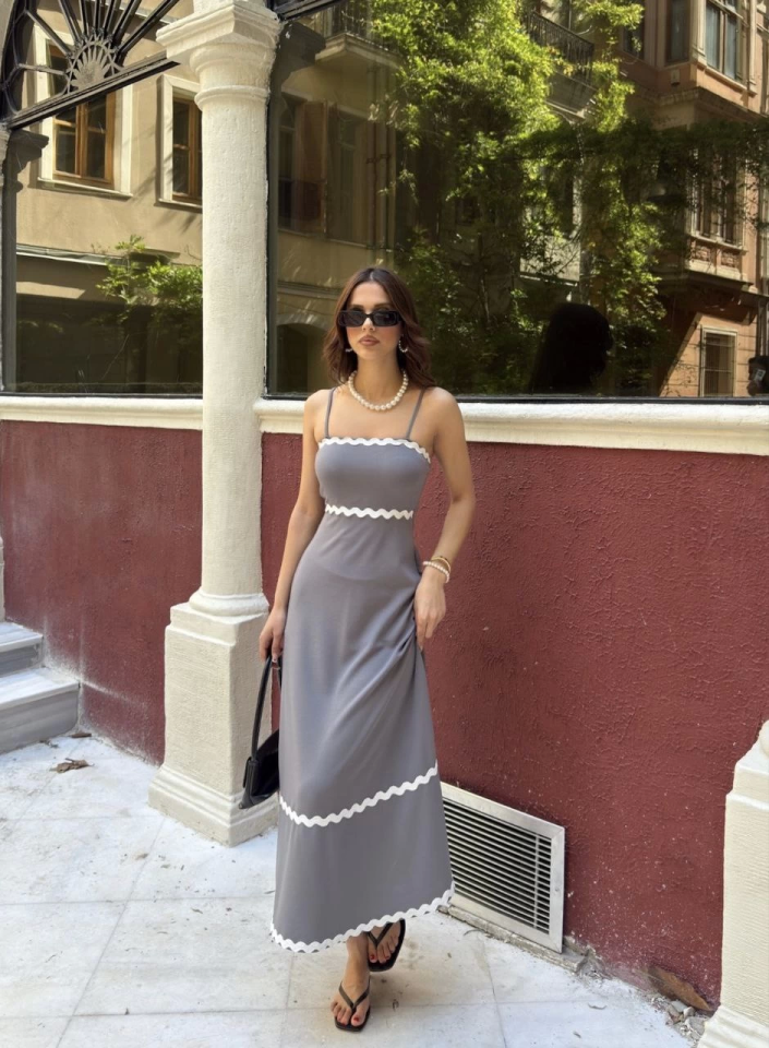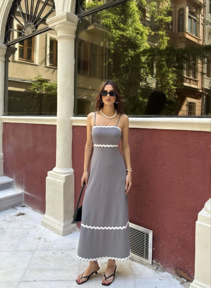 Askılı Uzun Şerit Detaylı Şık Ve Rahat Elbise – Gri