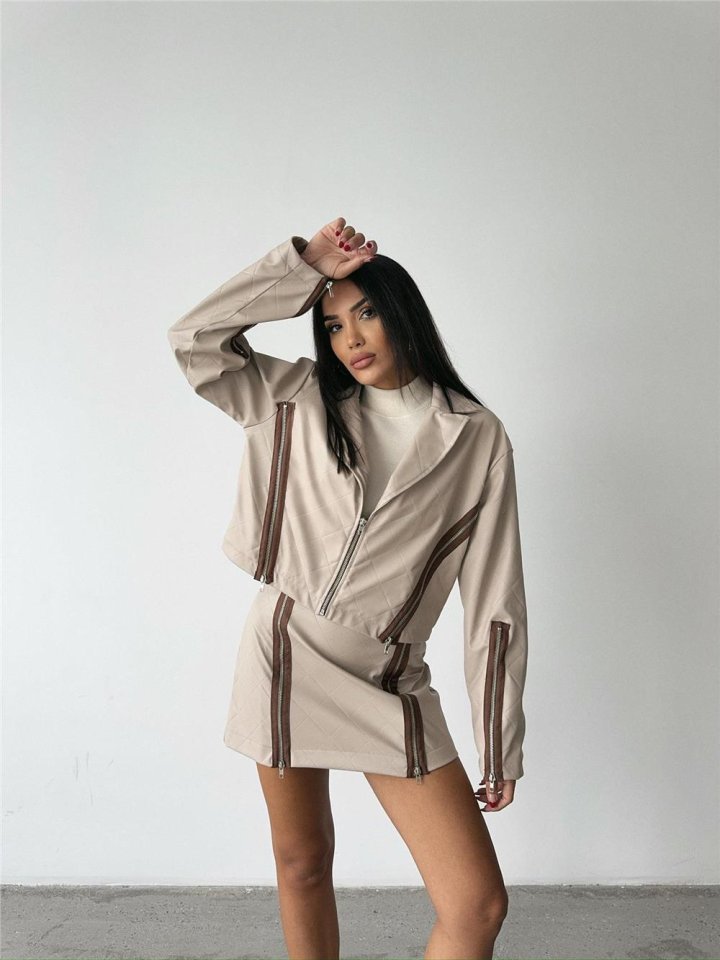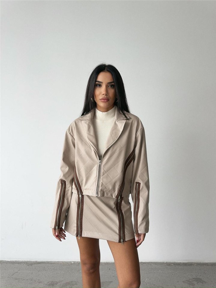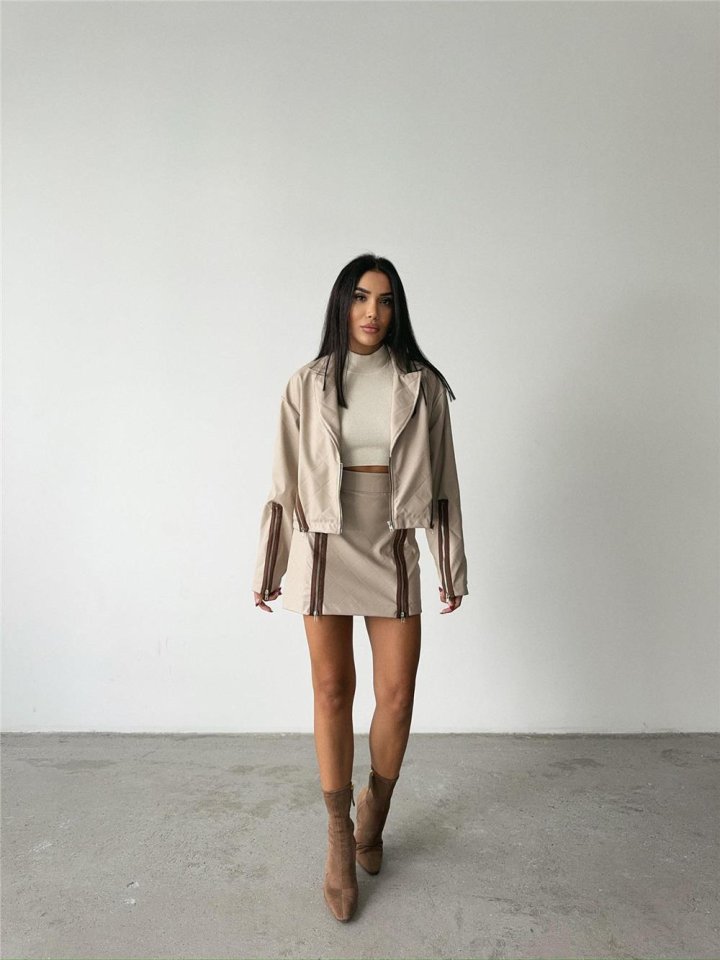 BAKLAVA DERİ CROP CEKET FERMUAR AKSESUAR DETAYLI – Bej