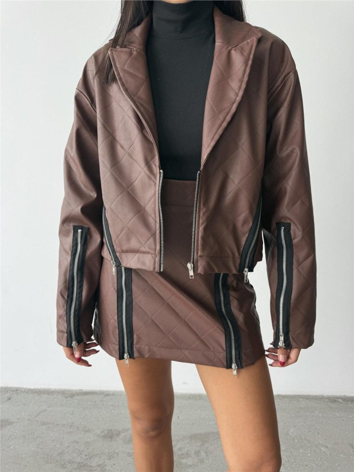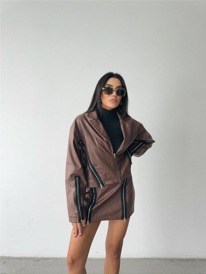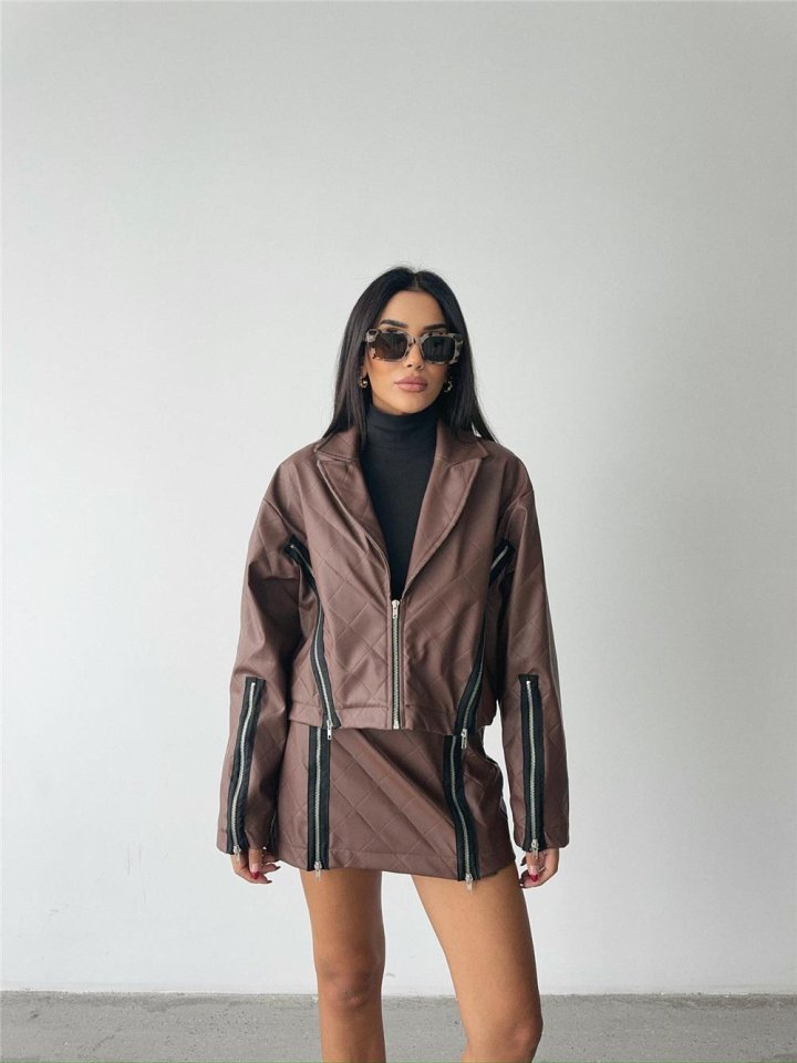 BAKLAVA DERİ CROP CEKET FERMUAR AKSESUAR DETAYLI – Kahverengi
