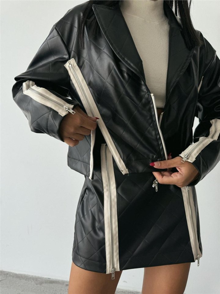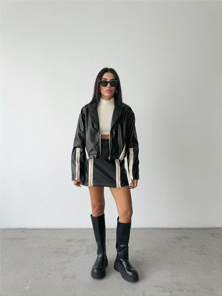 BAKLAVA DERİ CROP CEKET FERMUAR AKSESUAR DETAYLI – Siyah