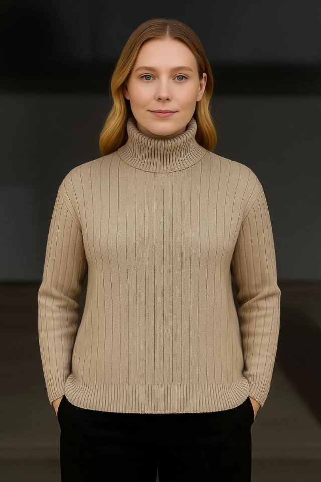 Balıkcı Yaka Bağazlı Triko Kazak Pamuklu Kalın Fitilli Dokuma – Bej