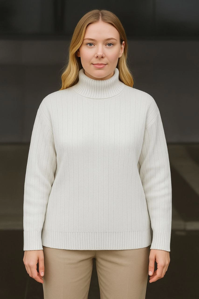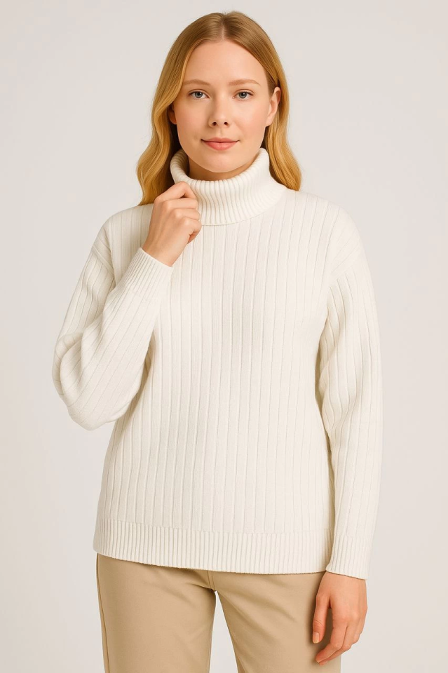 Balıkcı Yaka Bağazlı Triko Kazak Pamuklu Kalın Fitilli Dokuma – Beyaz
