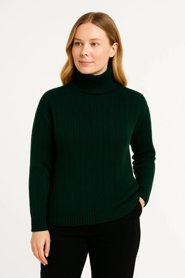 Balıkcı Yaka Bağazlı Triko Kazak Pamuklu Kalın Fitilli Dokuma – Haki