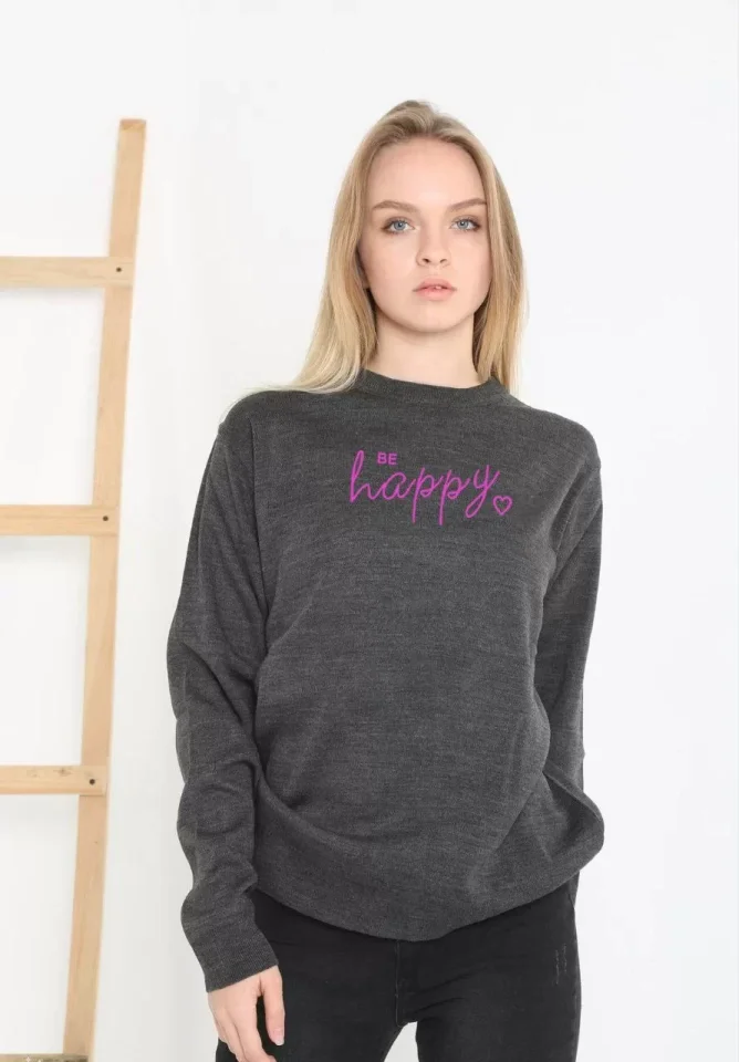 Baskılı Uzun Kol Yarım Boğazlı Dokuma Triko – Füme