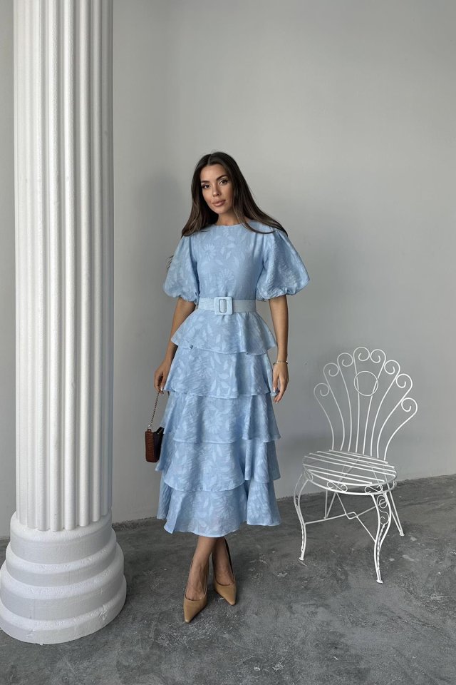 Bebe Mavi Kat Kat Balon Kollu Kemerli Elbise