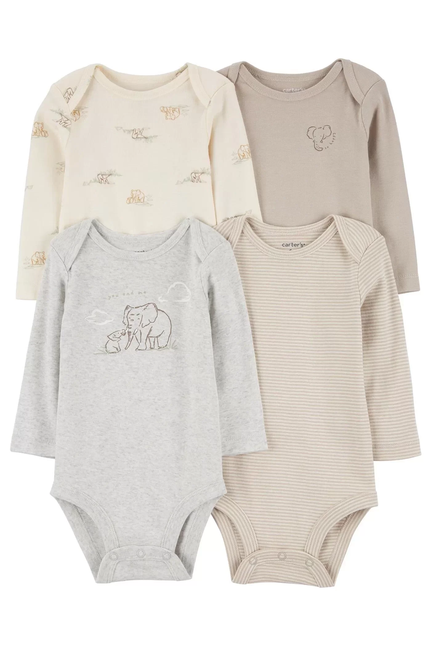Bu bebek zıbınları, kolay giyinmeleri için üst üste binen omuzlara ve minik yavrunuz için sevimli fil baskılarına yer verir.