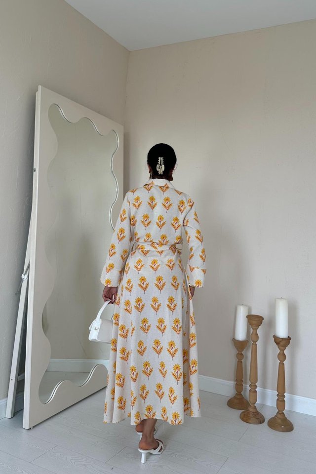 Bej Desenli Ve Önü Düğmeli Keten Elbise