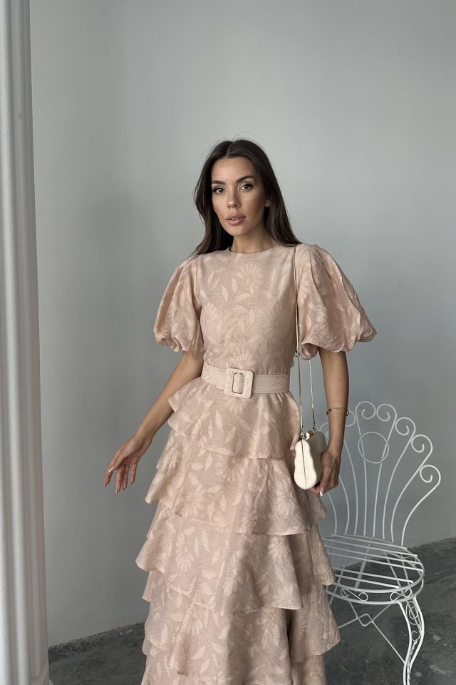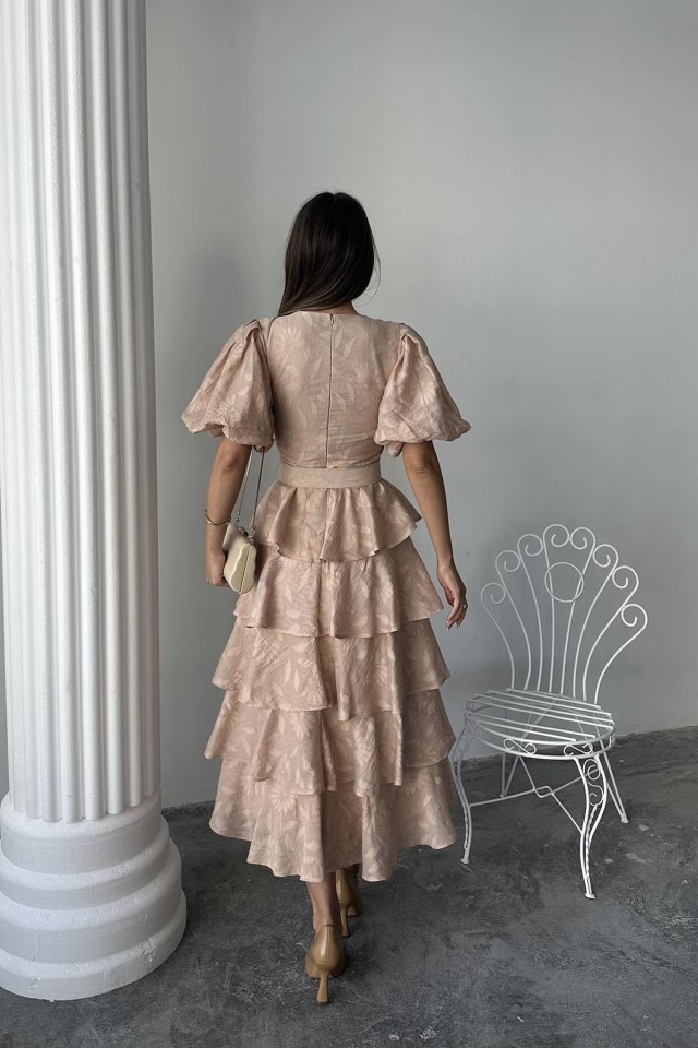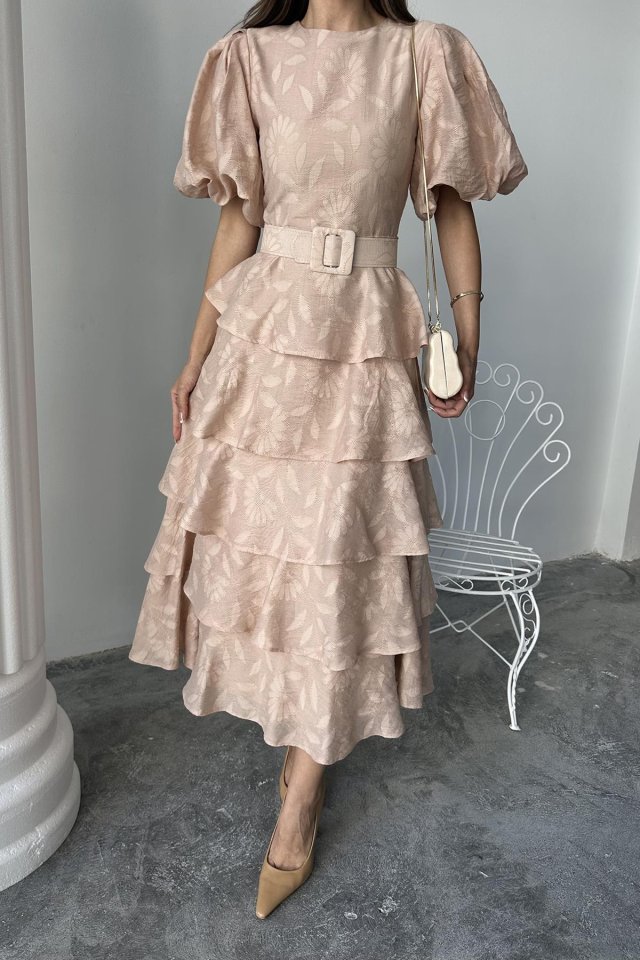 Bej Kat Kat Balon Kollu Kemerli Elbise
