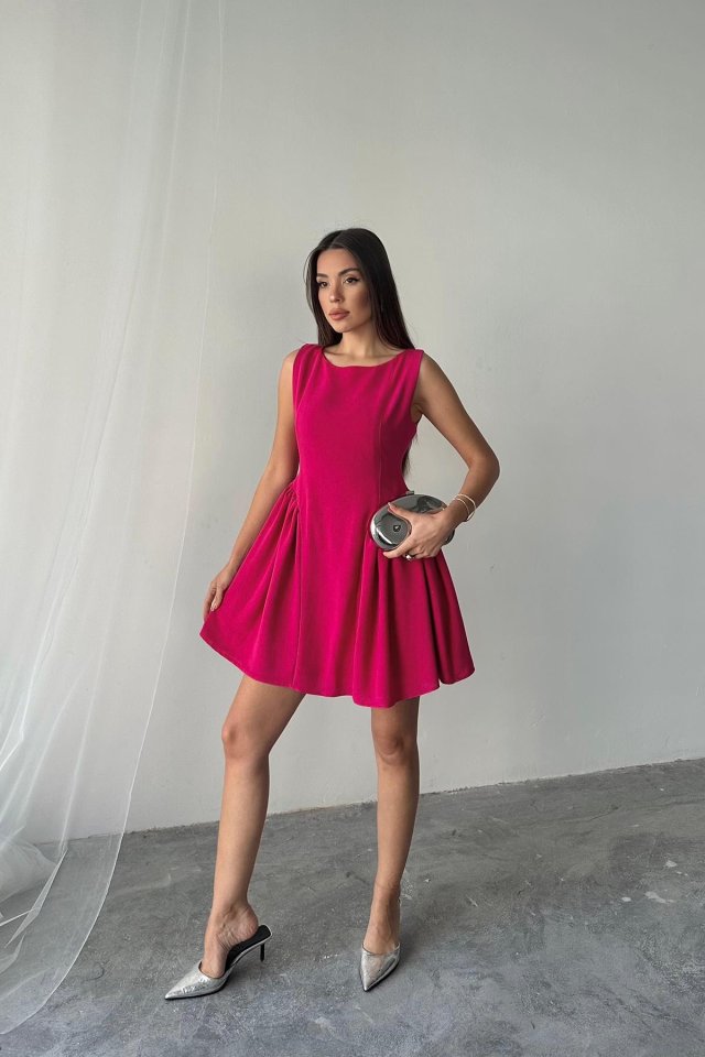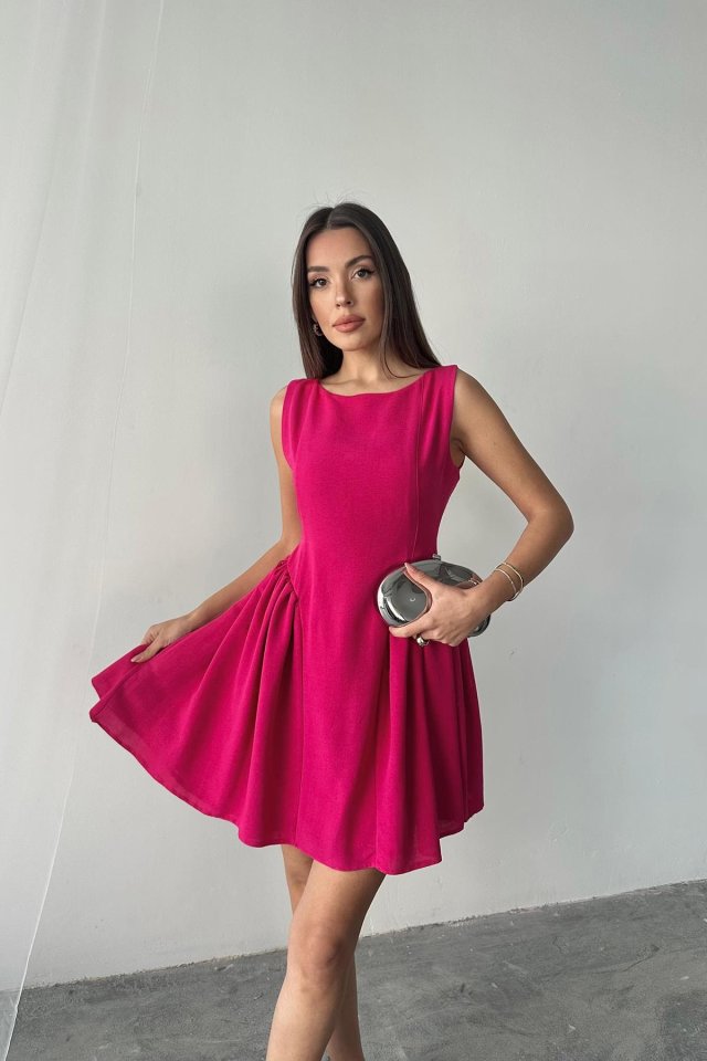 Fuşya Mini Boy Büzgülü Keten Elbise