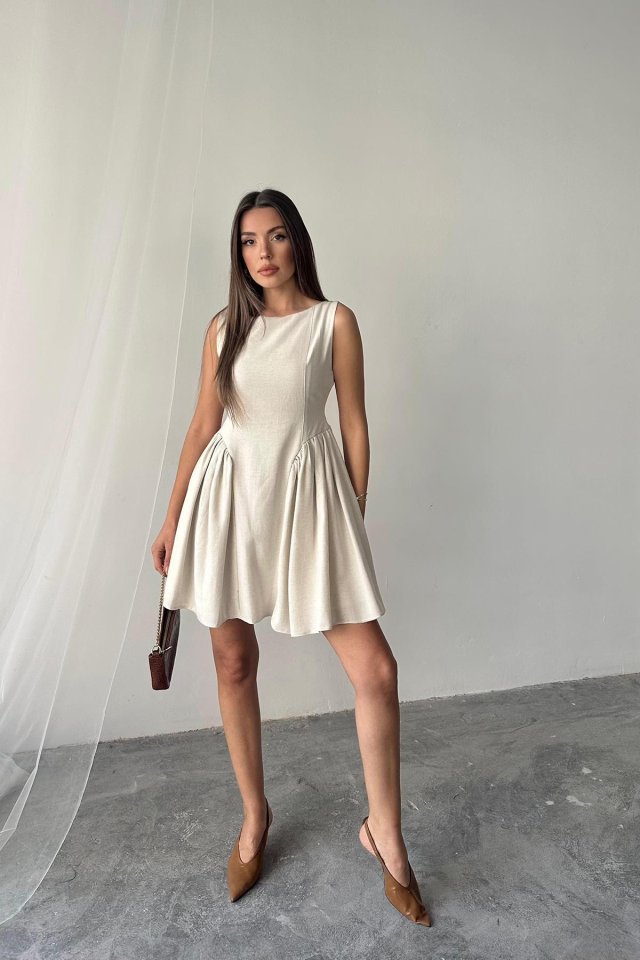Bej Mini Boy Büzgülü Keten Elbise
