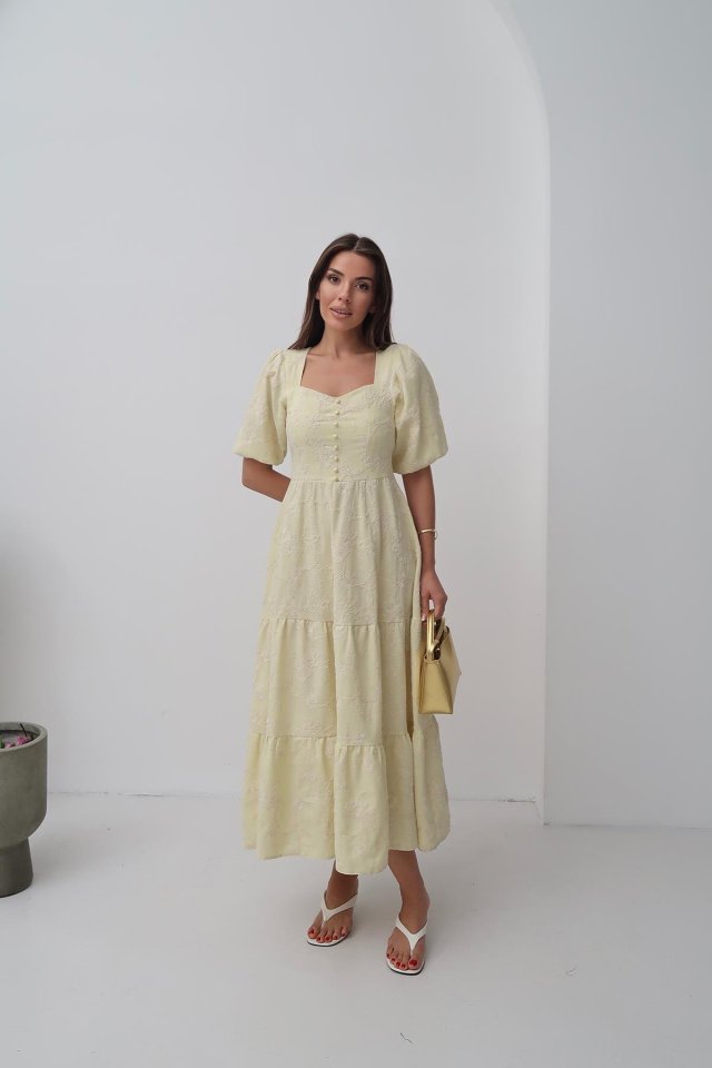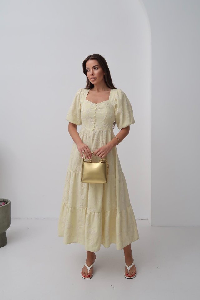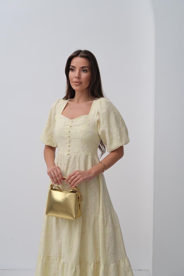 Bej Süs Düğmeli Balon Kollu Elbise