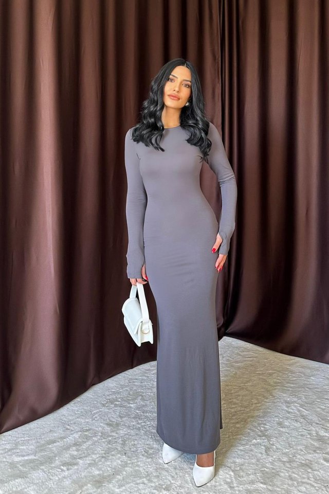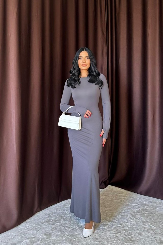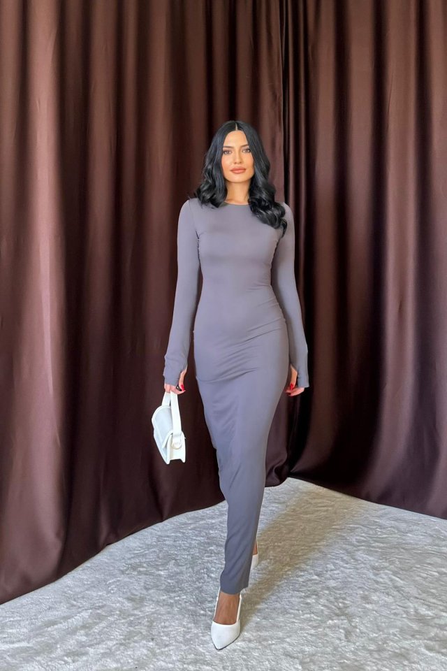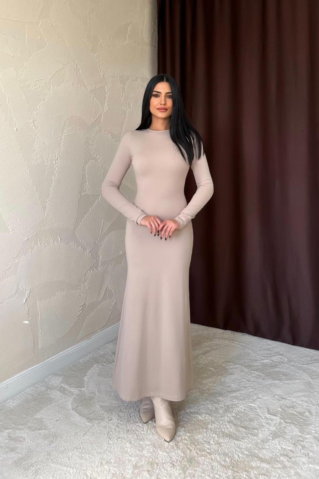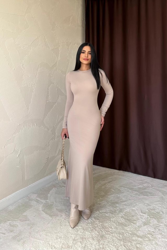 Bej Vücudu Saran Uzun Elbise