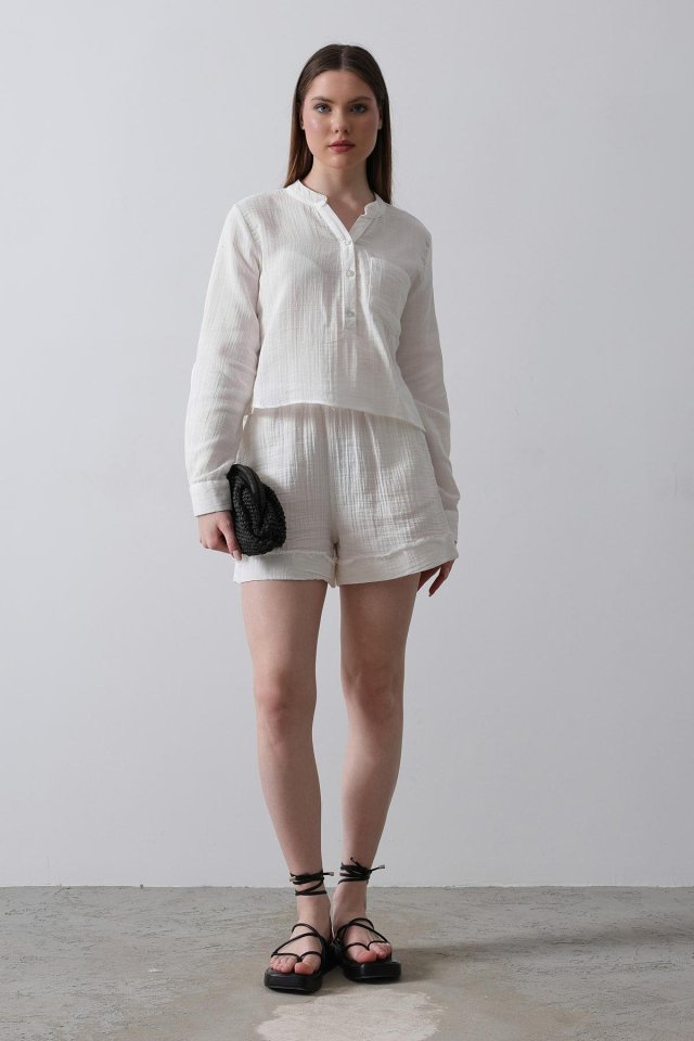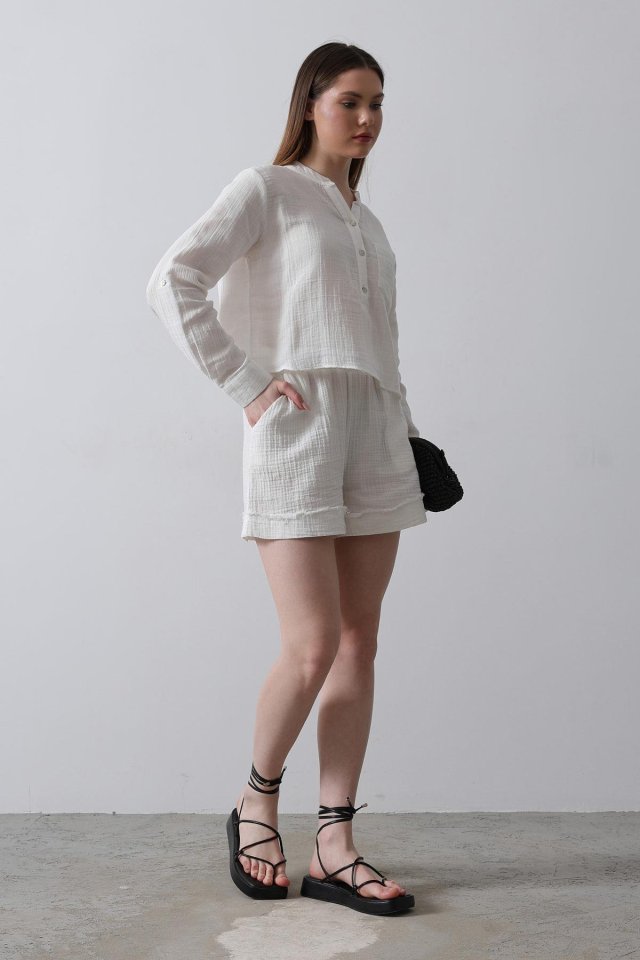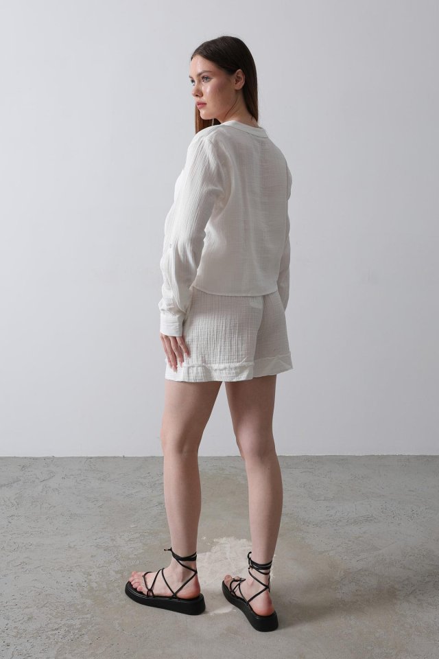 BELİ LASTİKLİ PÜSKÜLLÜ ŞORT – Beyaz
