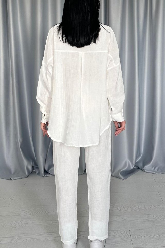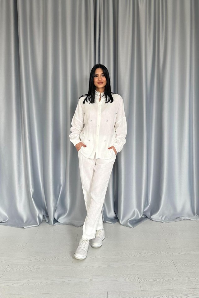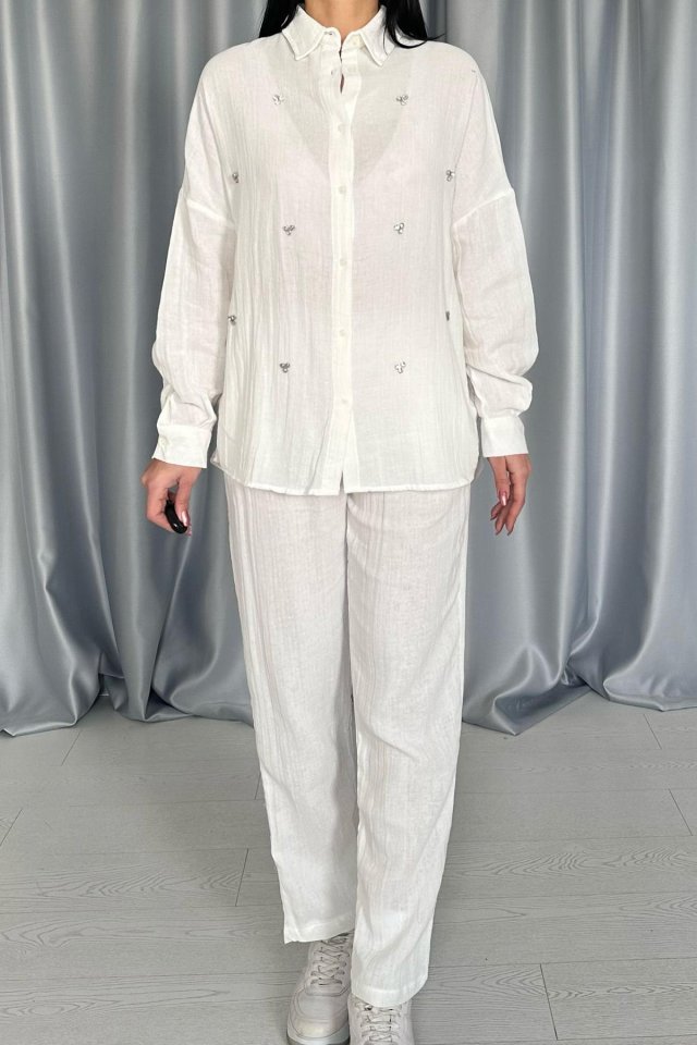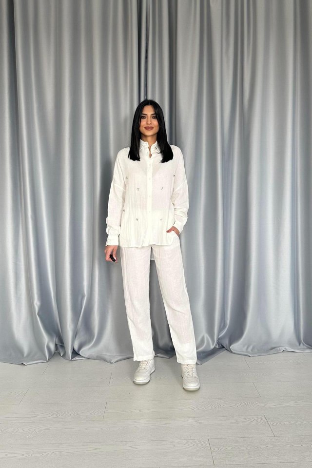 Beyaz 3 Taş Motifli Gömlek Ve Pantolon Takım