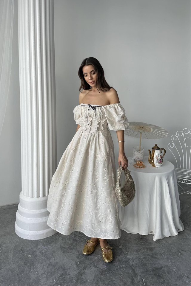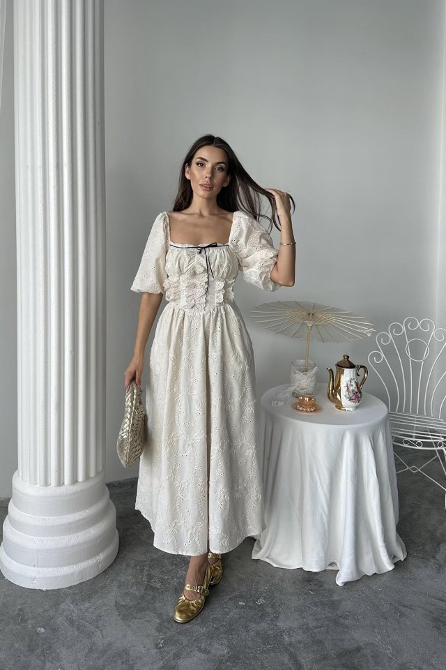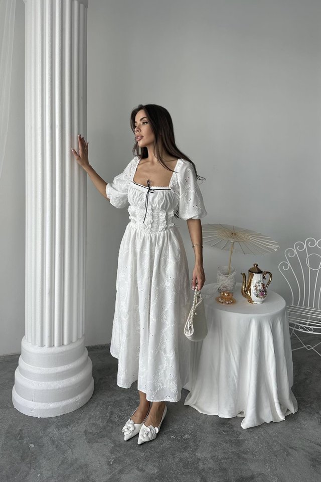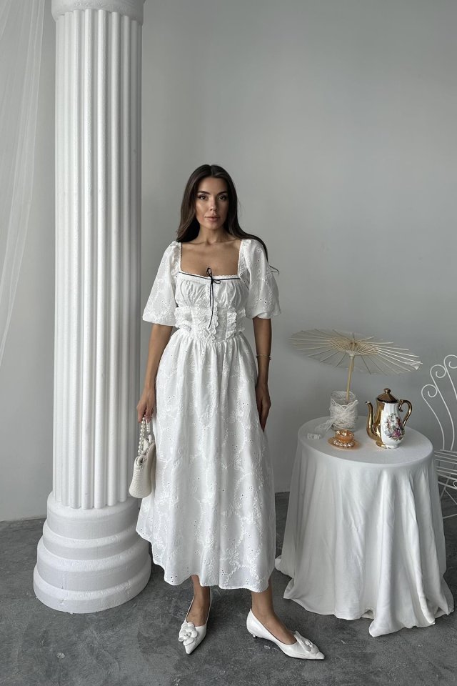 Beyaz Dantel Detaylı Brode Elbise