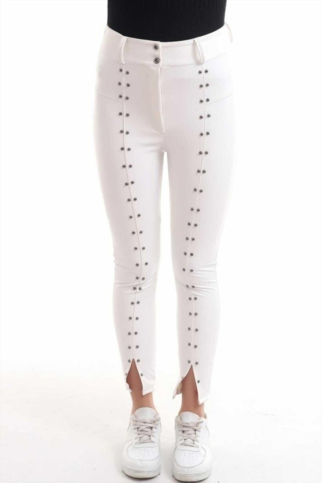 Beyaz Taş İşlemeli Deri Tayt