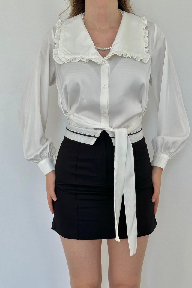 Beyaz Yakası Fırfırlı Kuşaklı Saten Gömlek