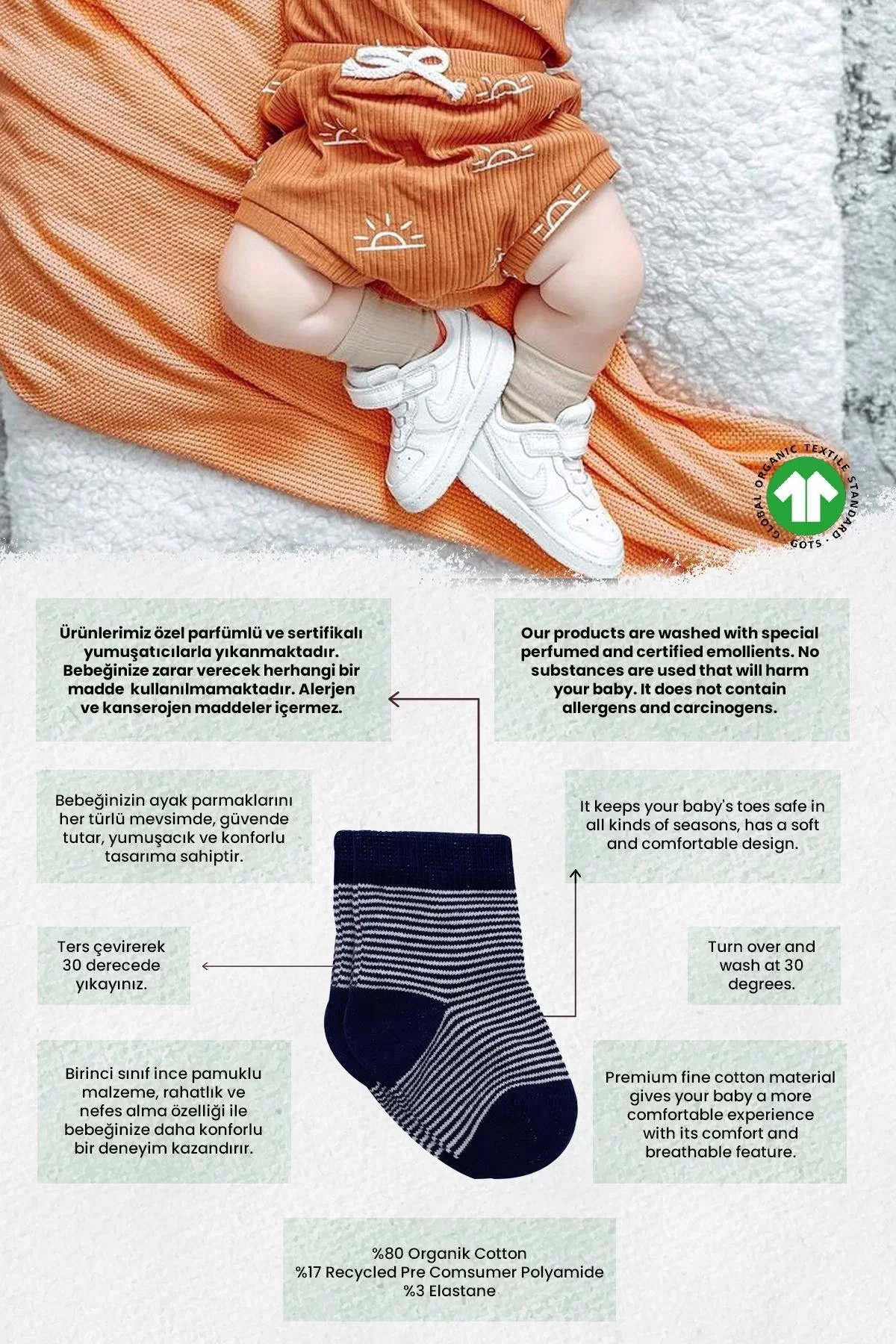 Yumuşak, nefes alabilir, nem emici ve kokulu Bistil çoraplarımız minik bebekleriniz için özenle üretilmiştir.