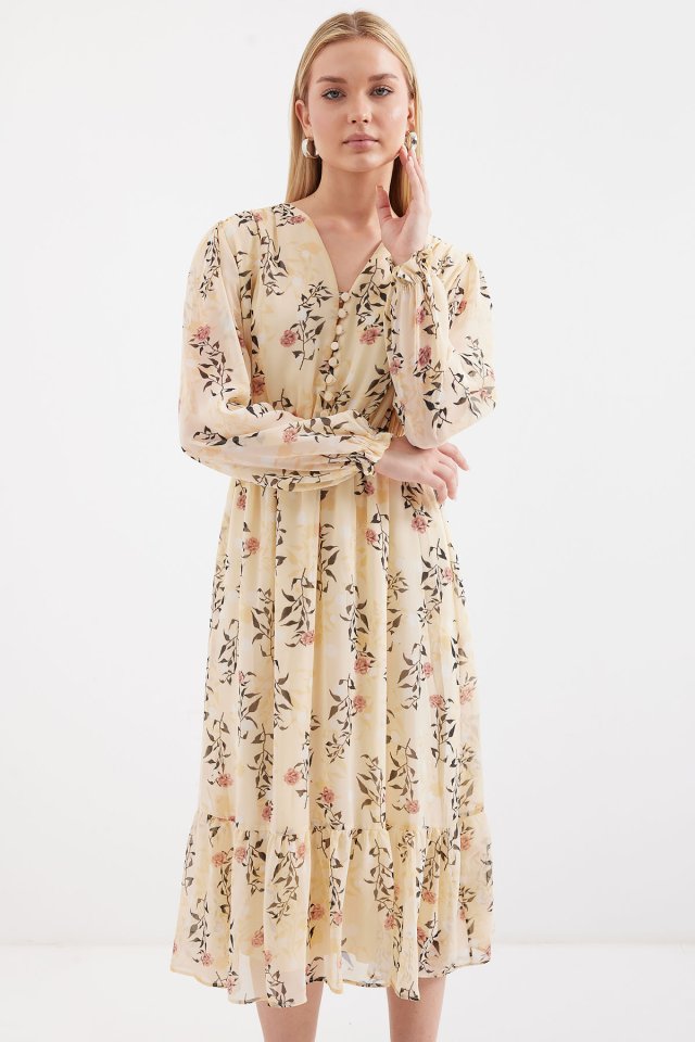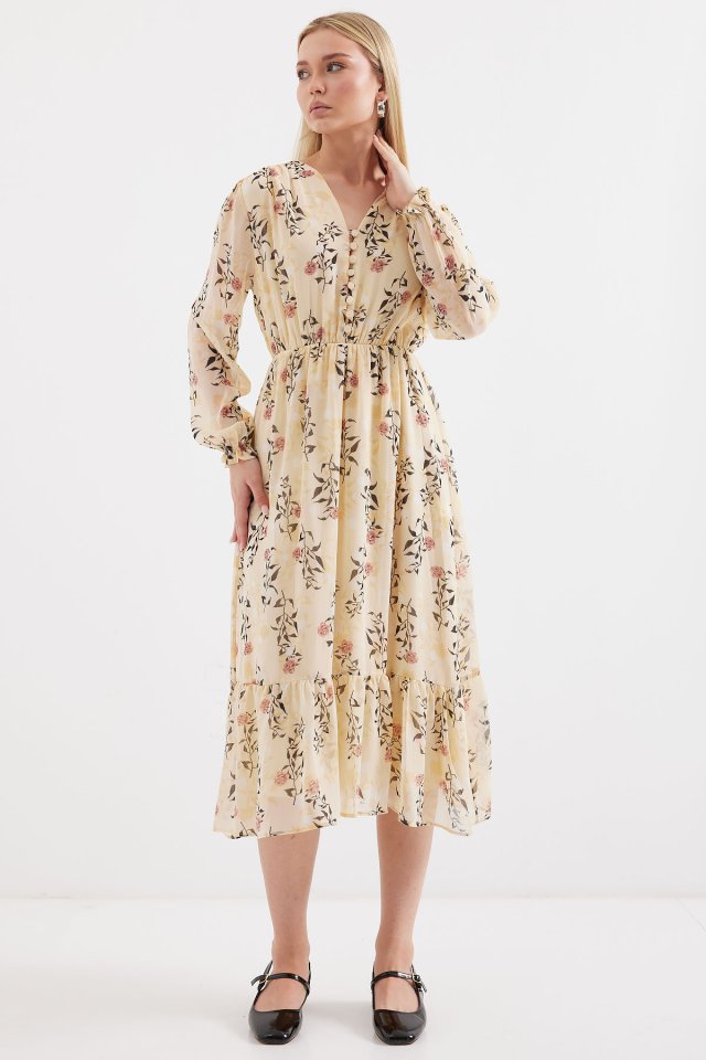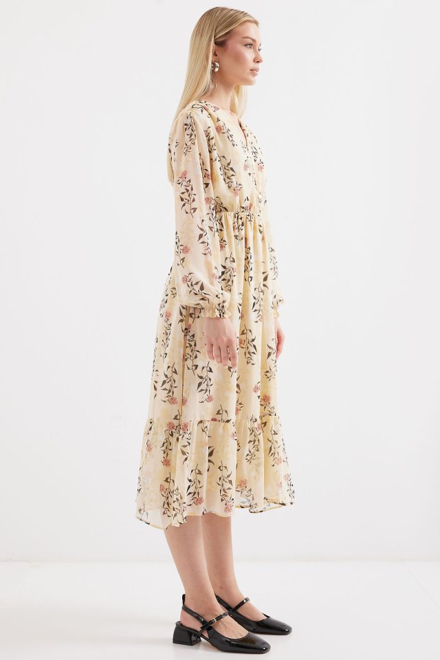 Bigdart 2137 Desenli Şifon Elbise – Krem