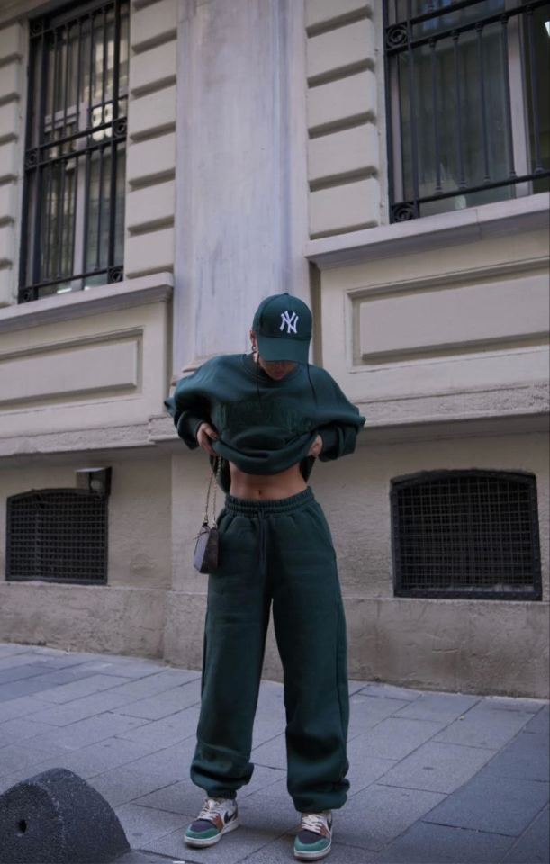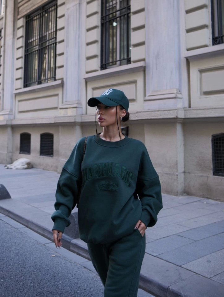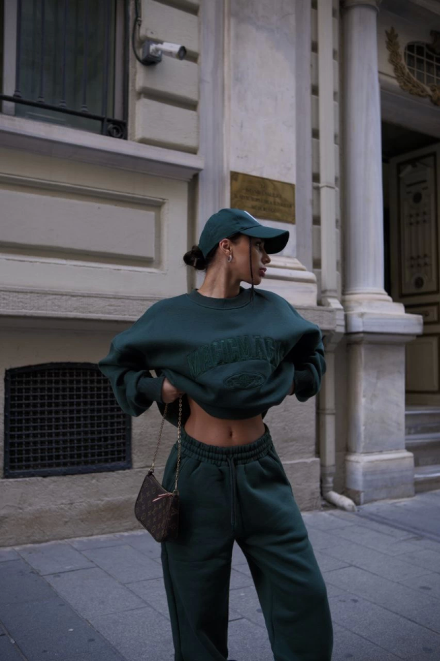 Bisiklet Yaka Nakış İşlemeli Üç İplik Sweat Takım – Yeşil