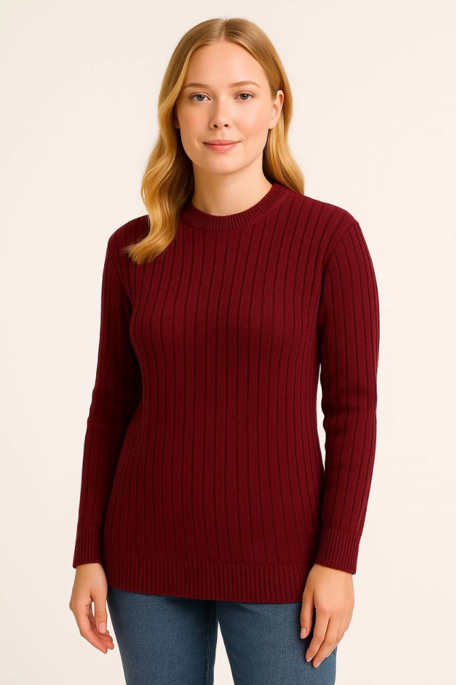 Bisiklet Yuvarlak Yaka Triko Kazak Pamuklu Kalın Fitilli Dokuma, Regular Fit Uzun Kollu Kışlık Model – Bordo